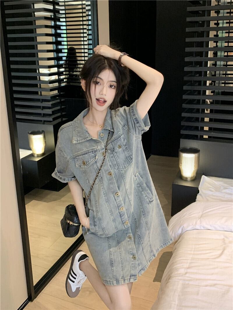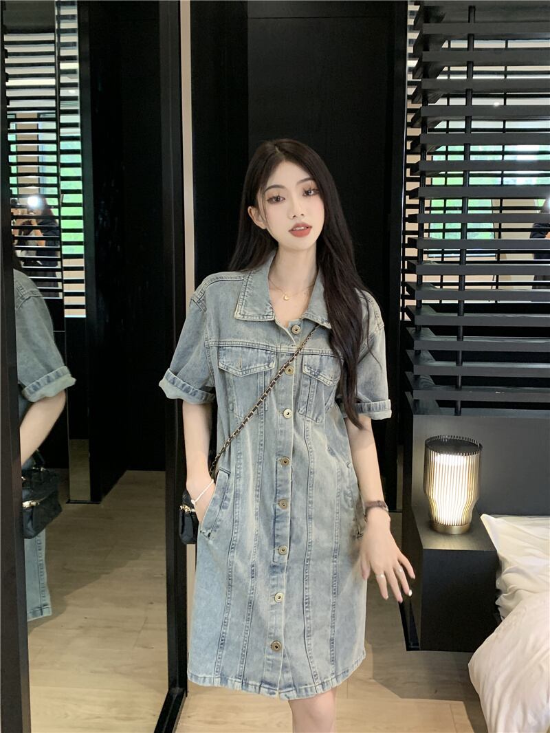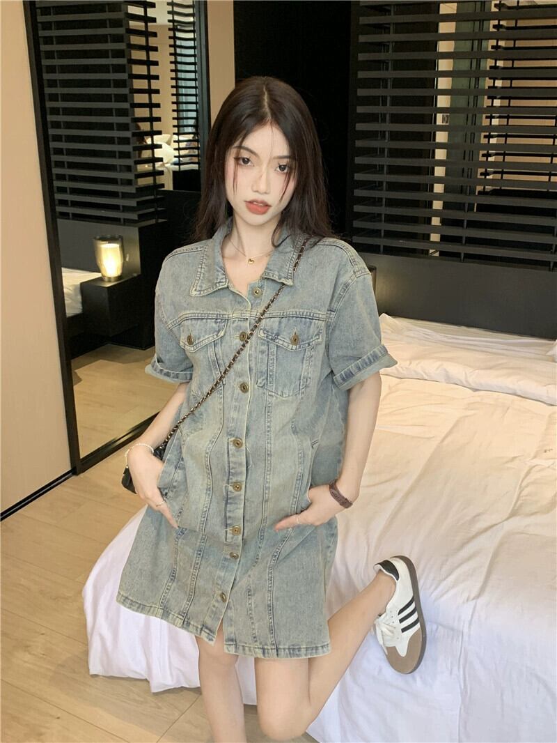 レトロなポロカラー半袖デニムドレス女性の夏の 2023 新しいデザインセンスウエスト甘辛ショートスカート 大人ガーリー スウィート キュート カジュアル サマー 夏物 0921937105409402
