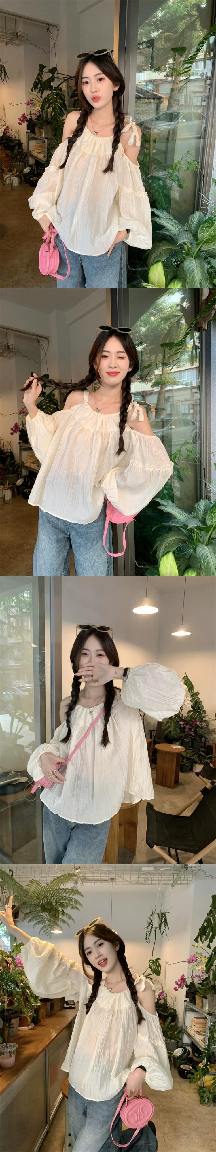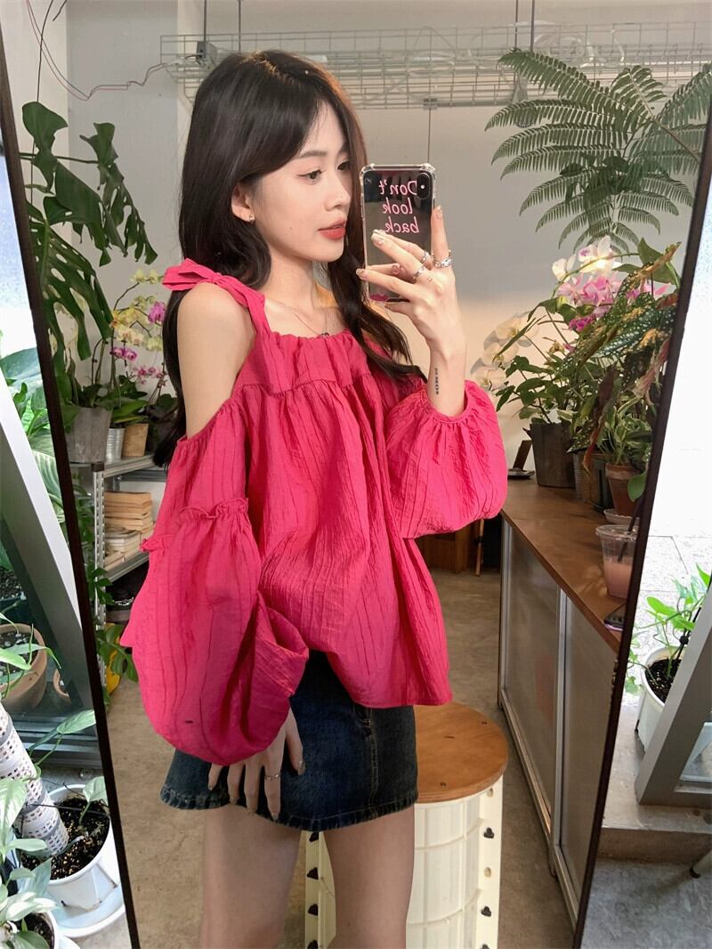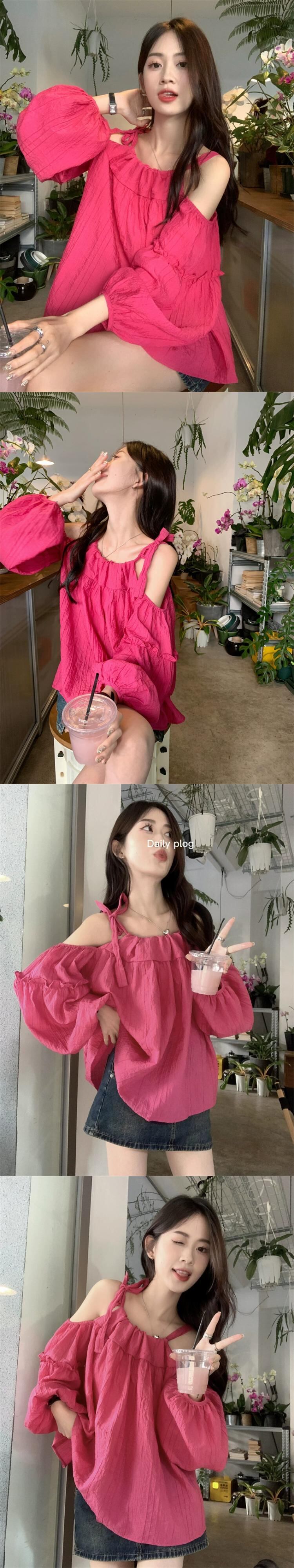 ピタヤカラーオフショルダーストラップスリングシャツレディース2023年夏新作甘辛スタイルルーズオールマッチ長袖トップ ロング 大人ガーリー スウィート キュート カジュアル サマー 夏物 0921926175593747