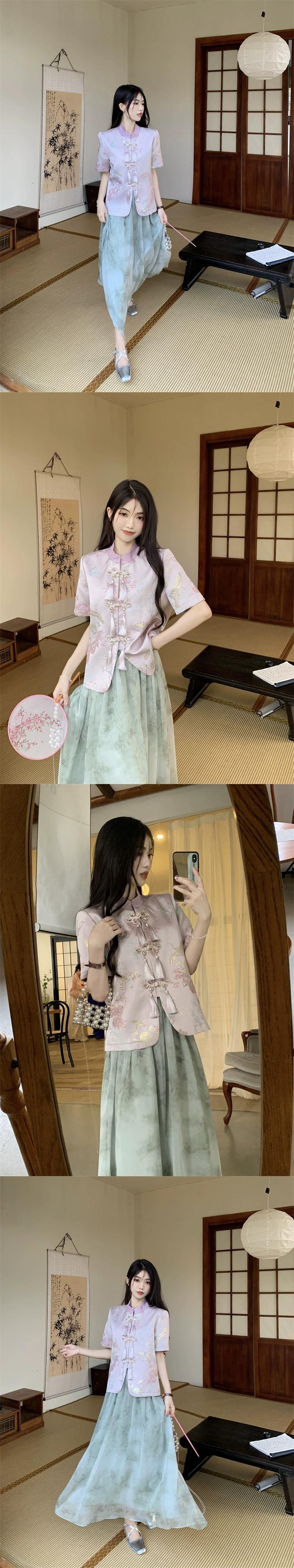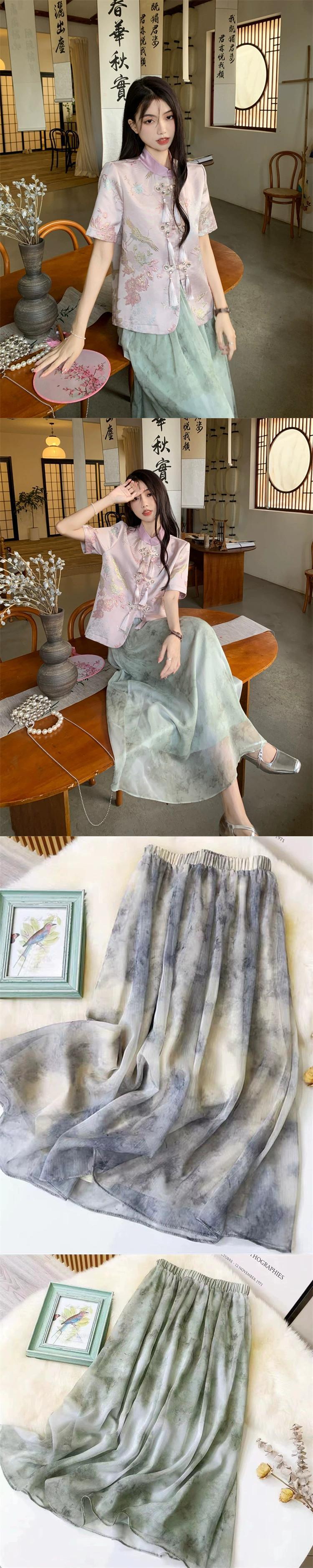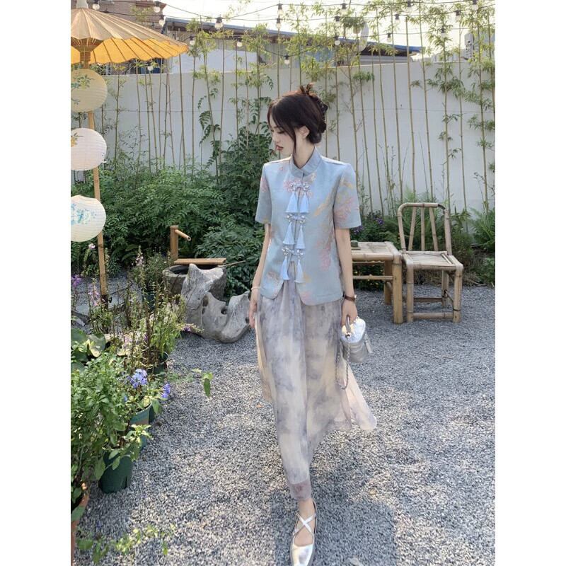 -終了国民スタイルのスーツの女性の 2023 夏の新しいジャカード刺繍シャツインクプリントスカート 2 点セット サマー 夏物 092192714219620
