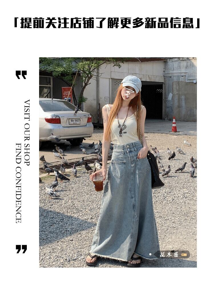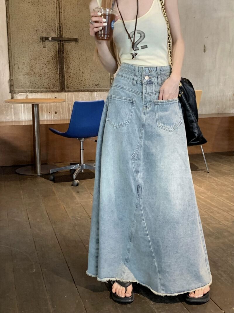 レトロなノスタルジックなデザインのハイウエストスカートの女性の 2023 夏の新しい緩くて薄いオールマッチ A ラインデニムスカート サマー 夏物 Aライン 0921941166255372
