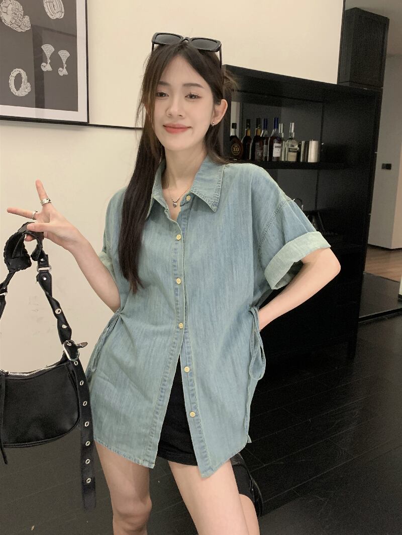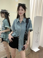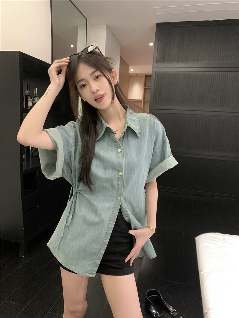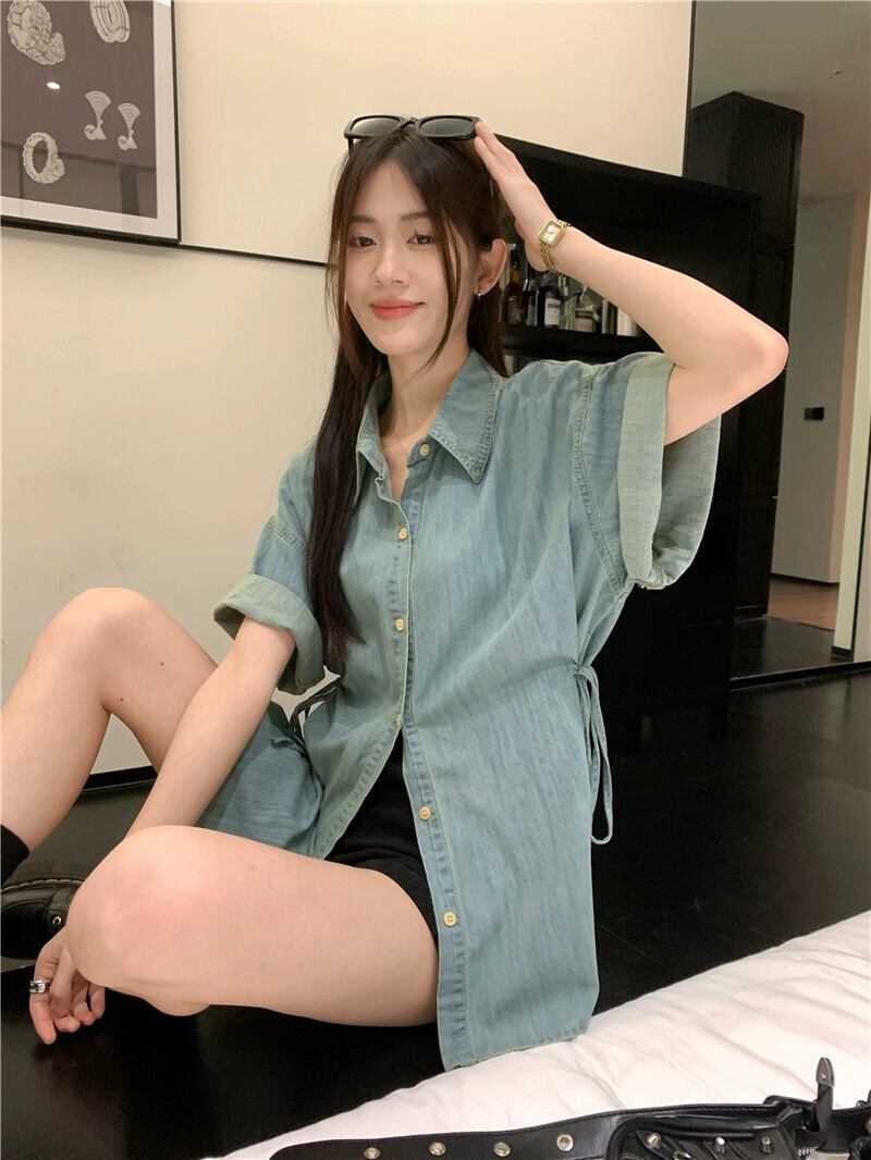 怠惰な風のバージョンのデニム半袖シャツ女性の夏の 2023 新しいミッドレングス ルーズ スリム カーディガン シャツ潮 サマー 夏物 0921956617757665