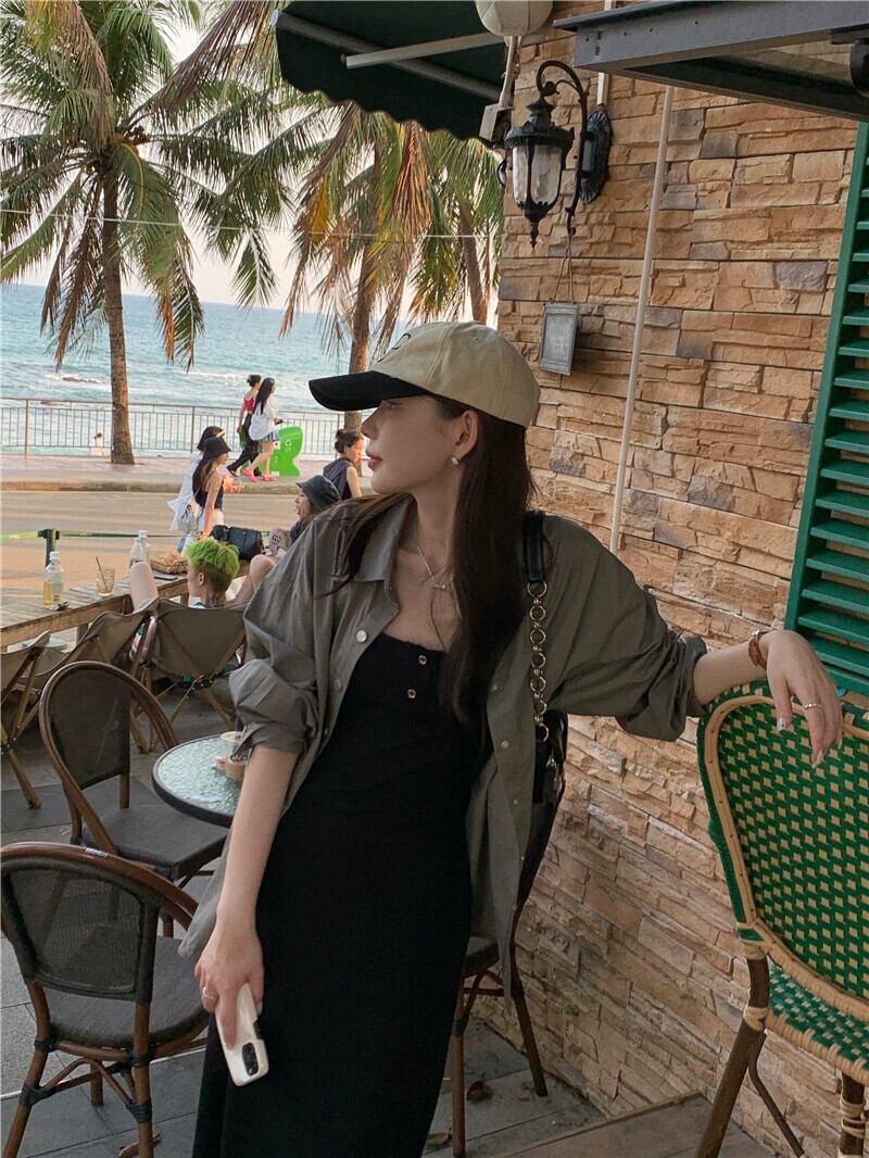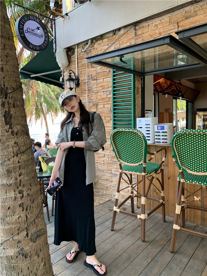 色:グレーグリーンのシャツ,黒のタンクスカート