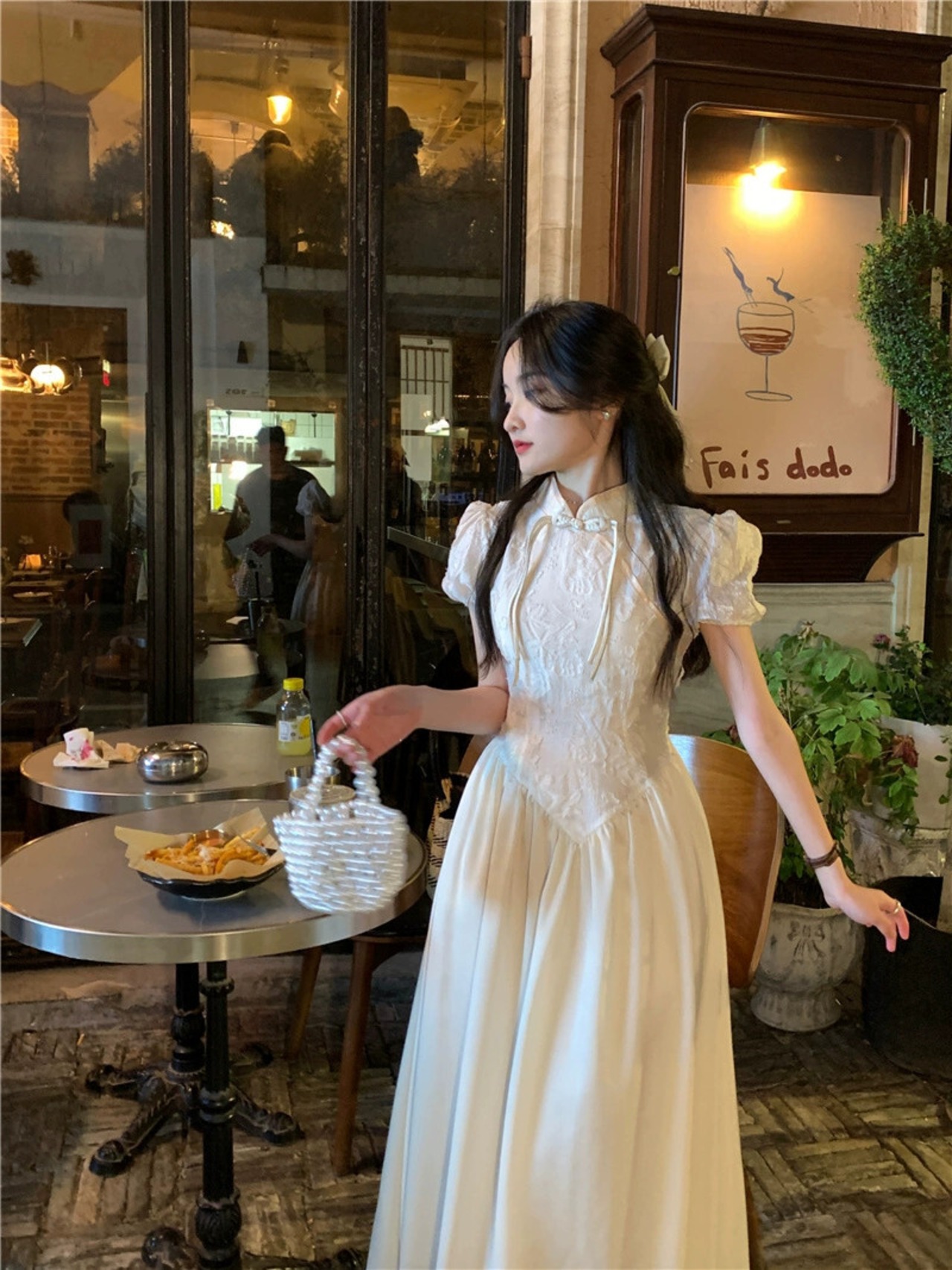 中国風の国民風のバックルスタンドカラードレスの女性の夏の 2023 新しいロングスカートウエスト痩身 a ラインスカート サマー 夏物 Aライン 092191093408186