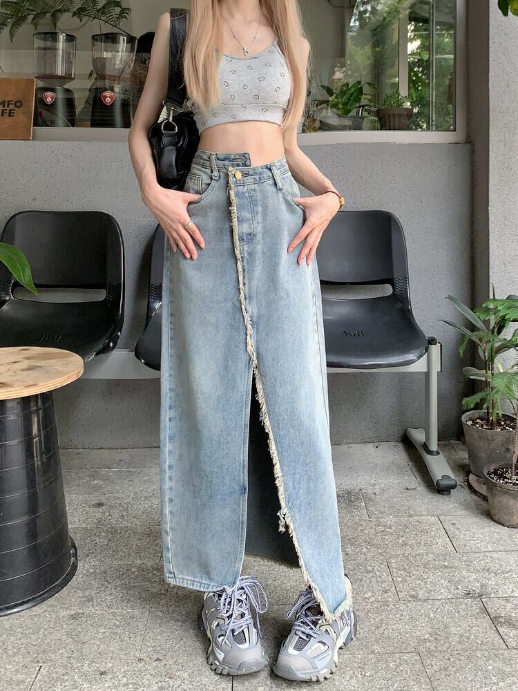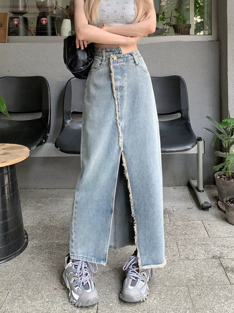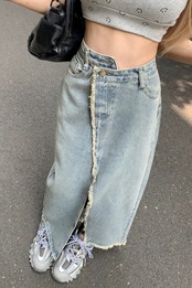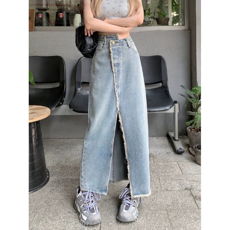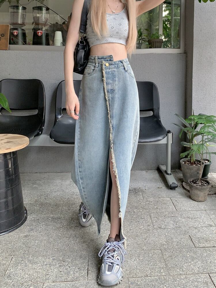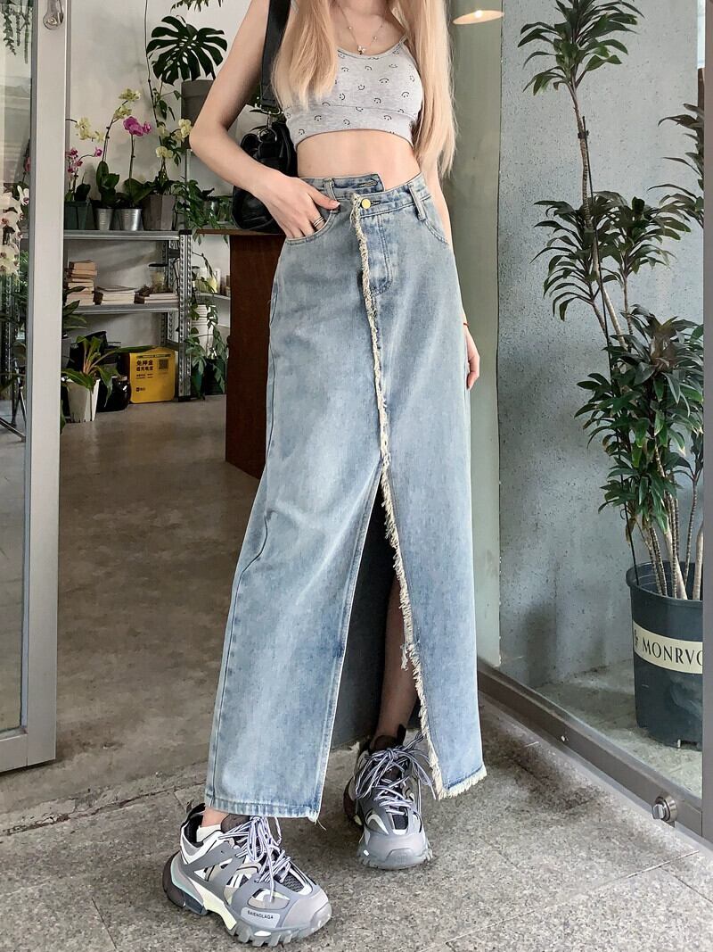 フリンジスリットデニムスカートのバージョンの女性の2023年夏新しい気質オールマッチハイウエスト薄いミドル丈スカート ハイウェスト サマー 夏物 0921973649648645