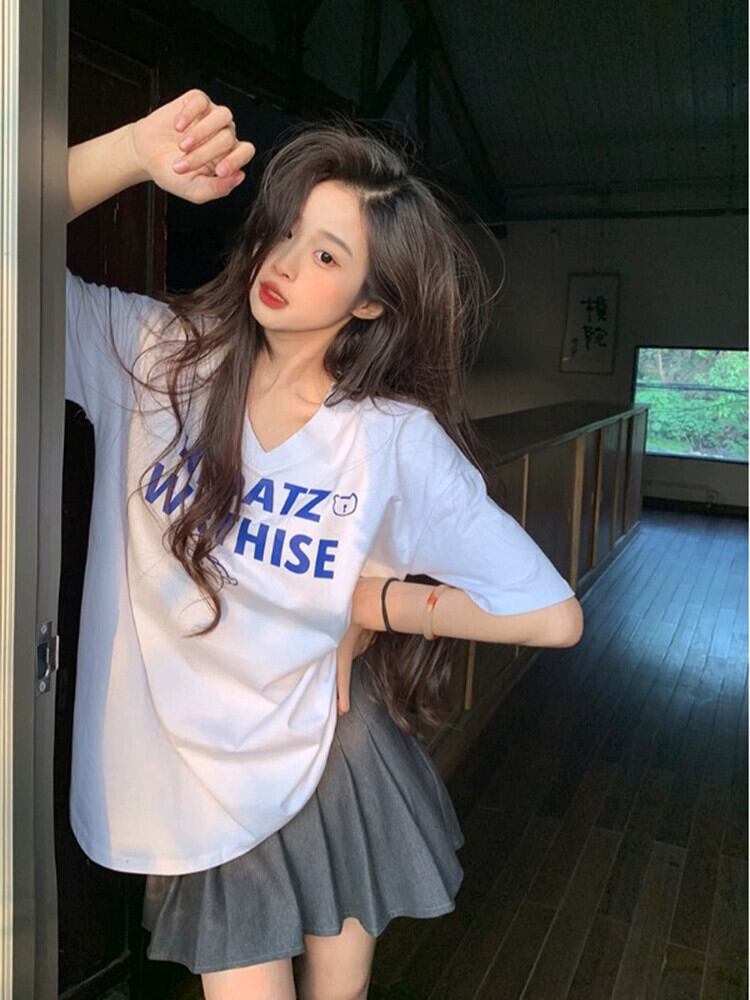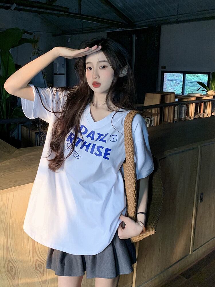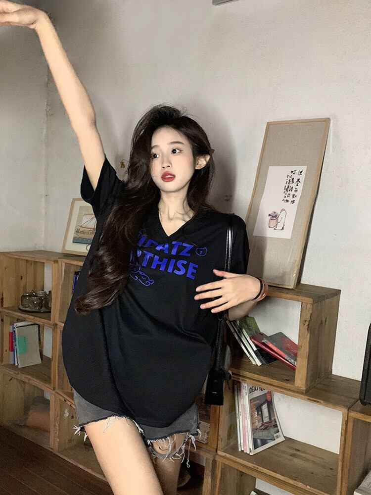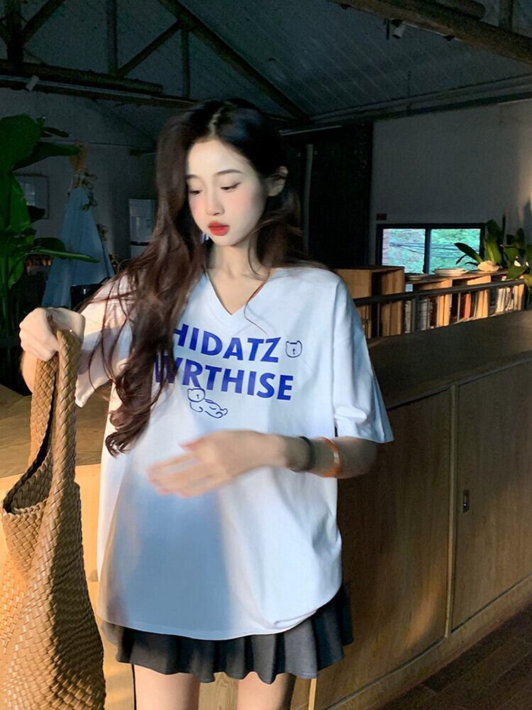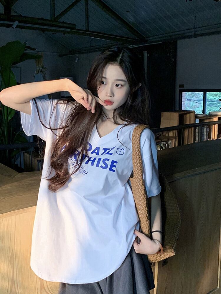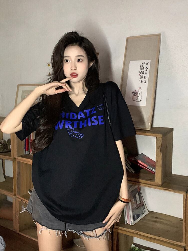 センスレタープリント Vネック半袖Tシャツレディース2023年夏新作オールマッチゆったり薄手インナートップトレンド サマー 夏物 09219414256498