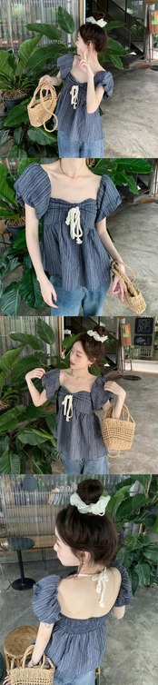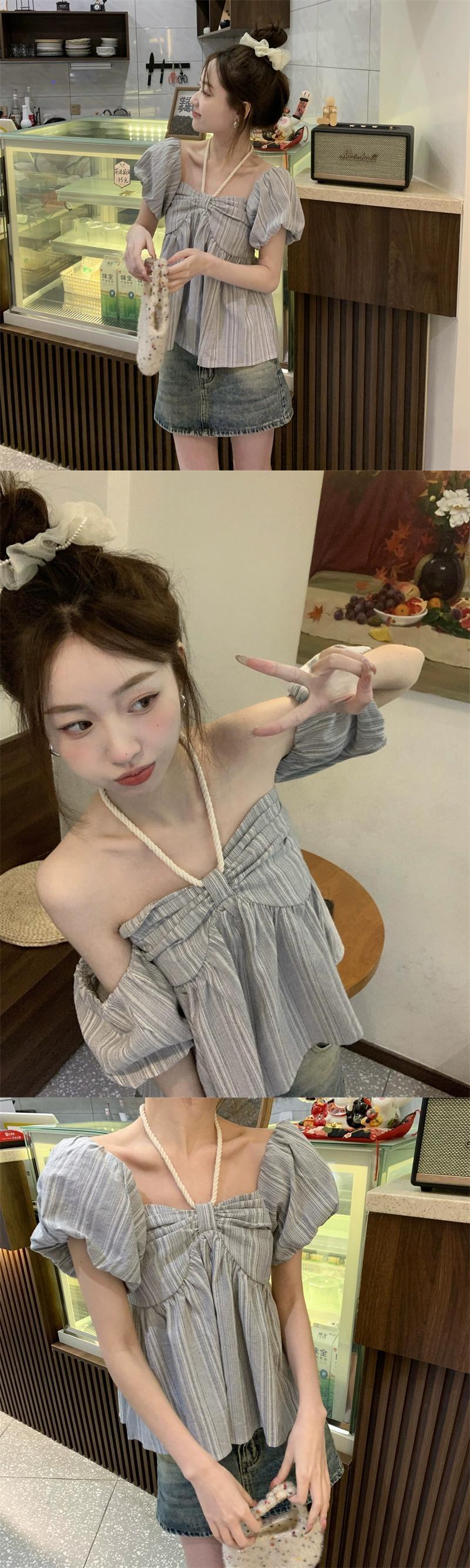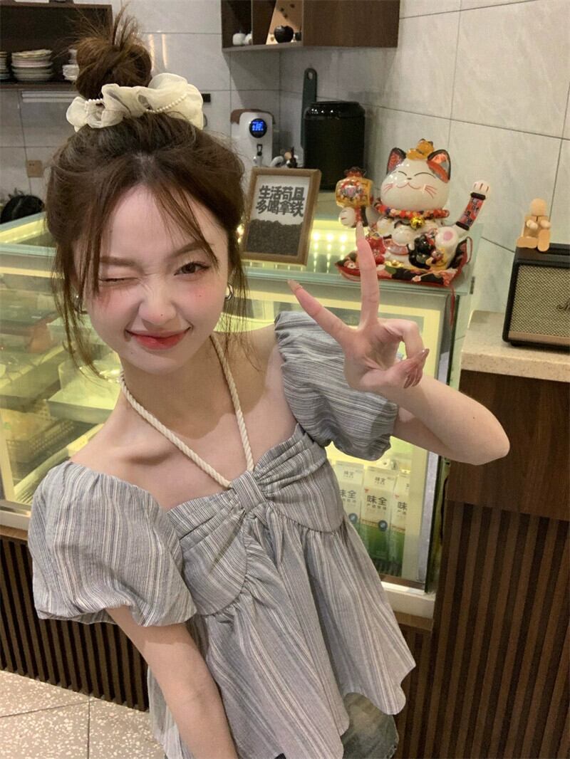 純粋な欲望風オフショルダー吊りネックパフスリーブシャツ女性の夏の 2023 新しいニッチデザインセンスショートストライプシャツ サマー 夏物 0921959218344801