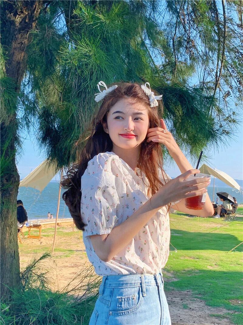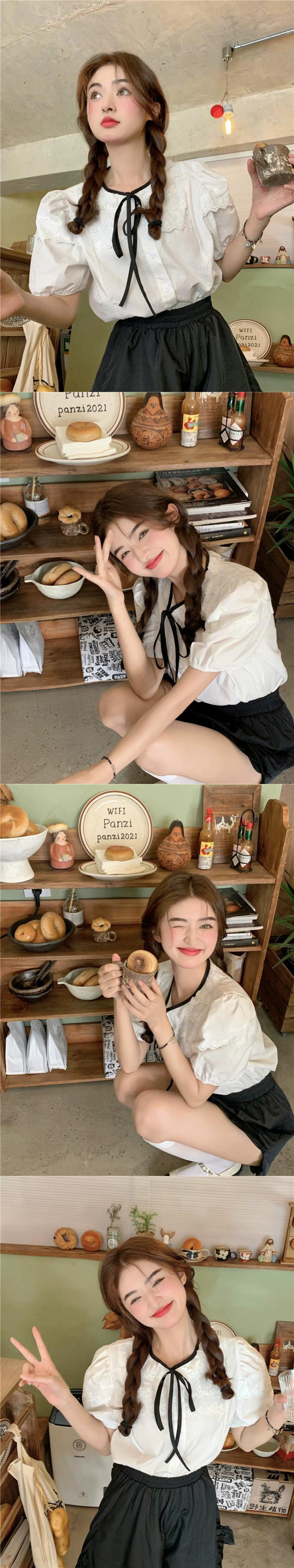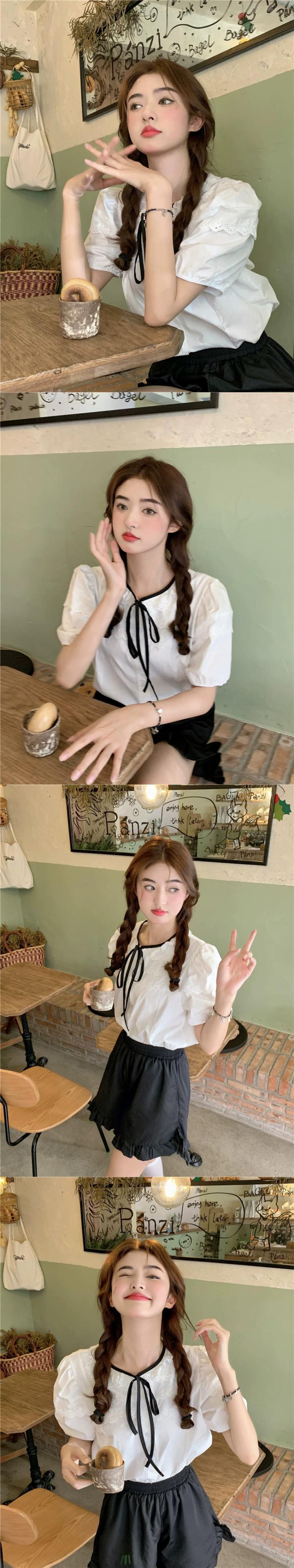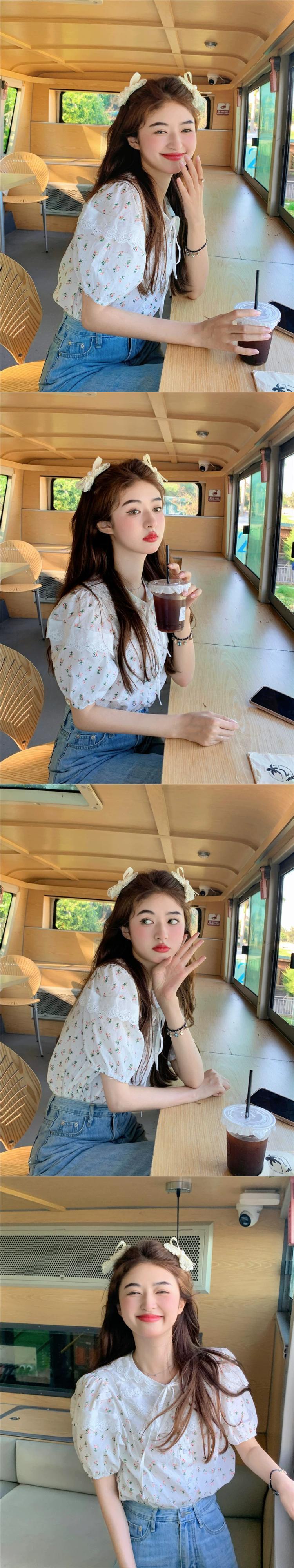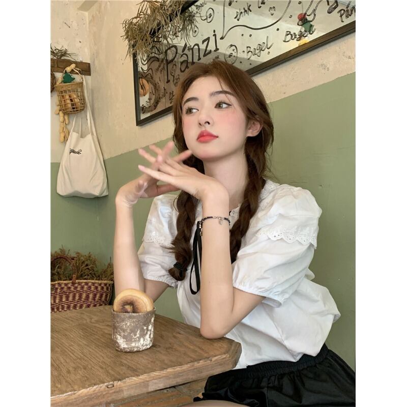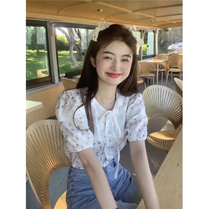 スタイルシックなレース人形襟花柄半袖シャツ女性の夏のレトロなパフスリーブショートシャツトップ サマー 夏物 0921975684141797
