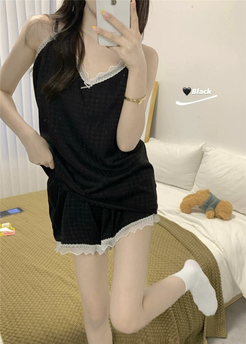 セクシーなレース V ネックサスペンダーパジャマセット女性の夏のアイスシルクハイウエストショートパンツカジュアルホームサービス 2 点セット ハイウェスト サマー 夏物 Vネック 0921957709650312