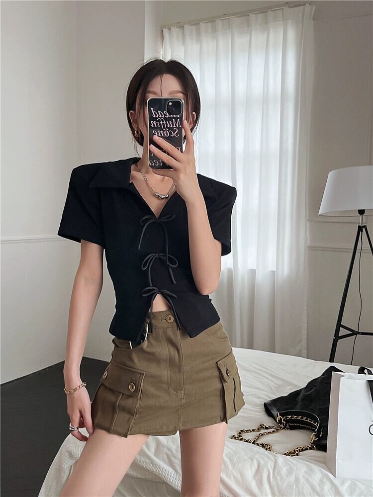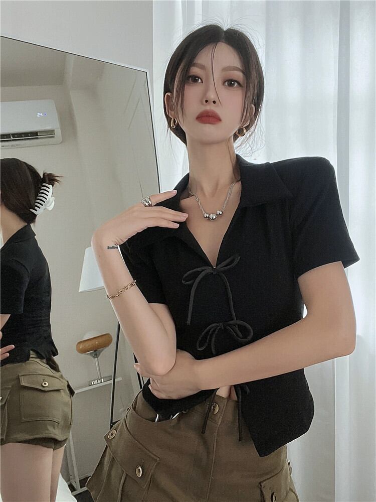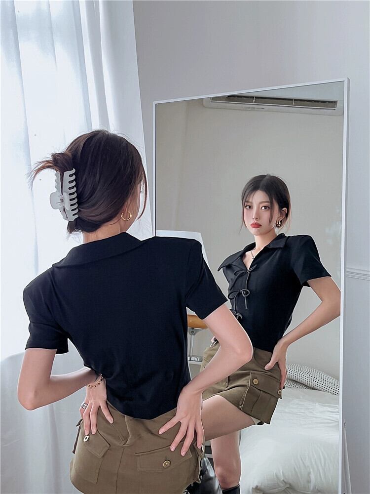 Spice Girl ラペルリボンフロントショルダー Tシャツ レディース 夏 2023 スリム半袖不規則ショートトップ サマー 夏物 0921943096164348