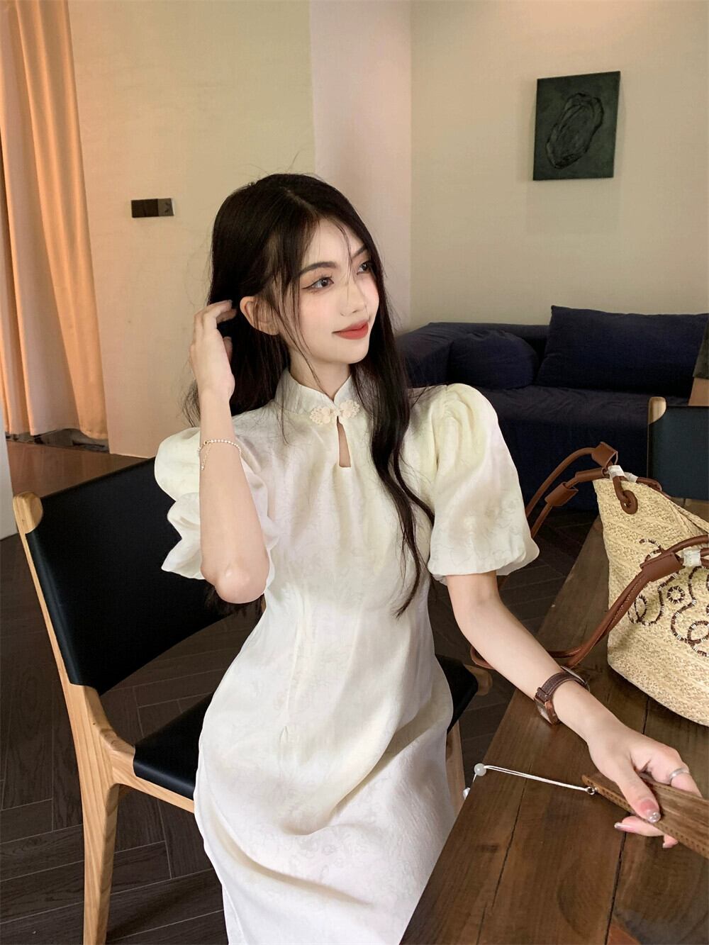 中国風ジャカードチャイナドレスレトロバックルスタンドアップカラードレス女性の夏の気質パフスリーブウエストロングスカート サマー 夏物 0921929027209800