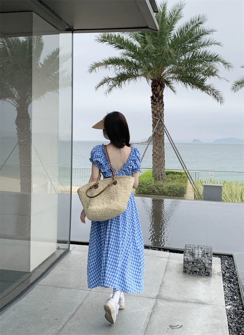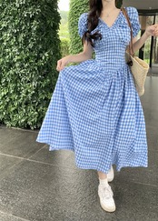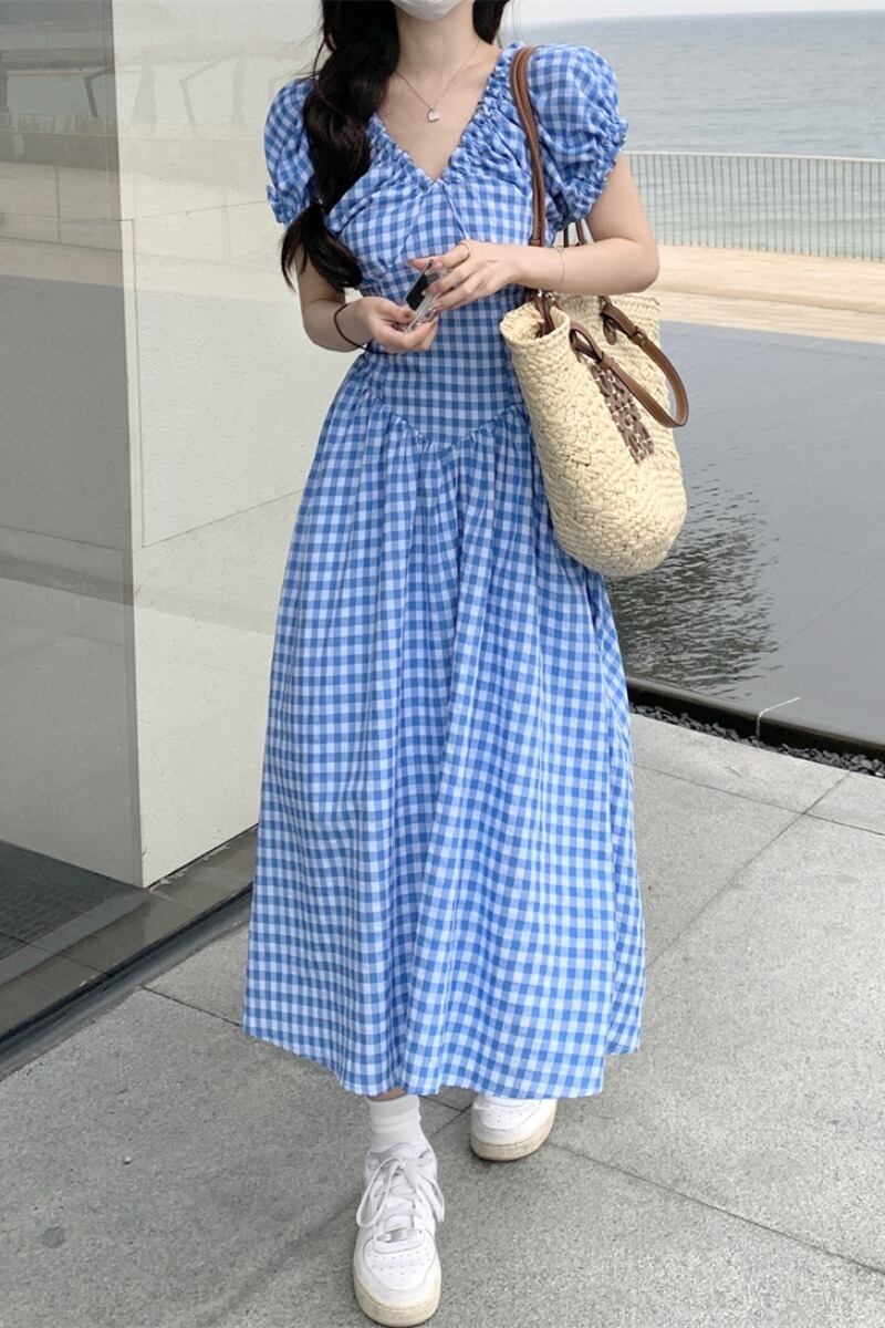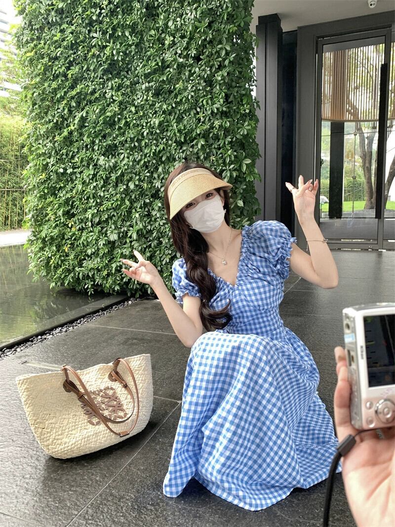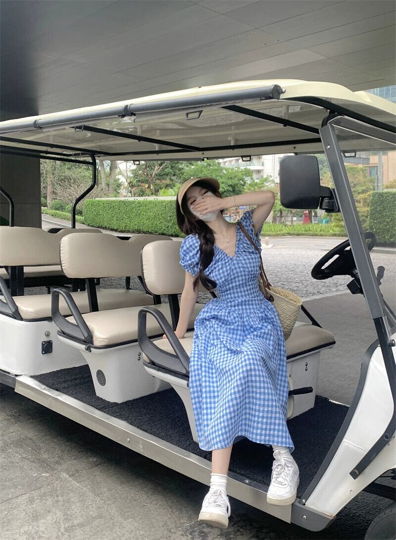 フレンチブルーチェック柄 V ネック半袖ドレスの女性の 2023 夏の新しい甘いスタイルスリムスリムミドル丈スカート 大人ガーリー スウィート キュート カジュアル サマー 夏物 Vネック 0921931642529528