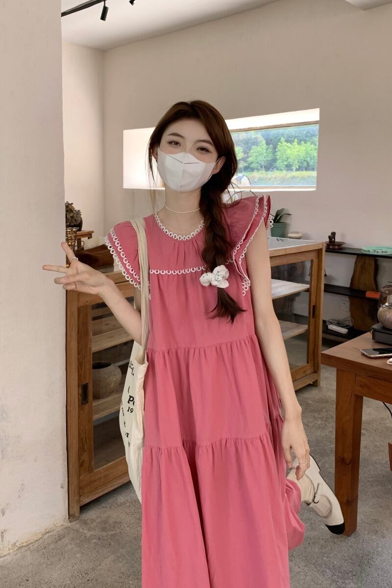 甘いピンクの小さなフライングスリーブドレスの女性の夏 2023 新年齢削減カラーコントラストレースミッドレングススリムスカート 大人ガーリー スウィート キュート カジュアル サマー 夏物 0921941713025887