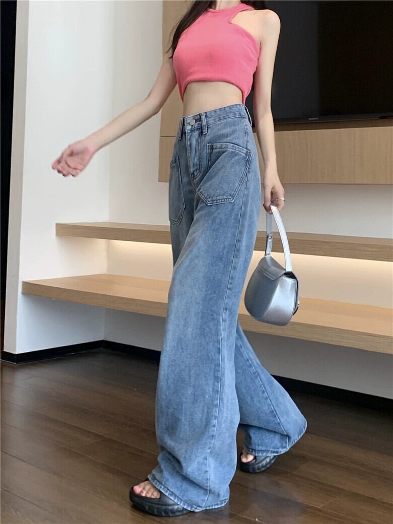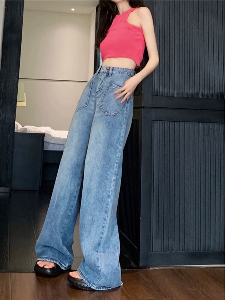 レトロハイウエストルーズスリムジーンズ女性の夏の2023新しい気質オールマッチカジュアルワイドレッグモップパンツ ハイウェスト サマー 夏物 092197268437002