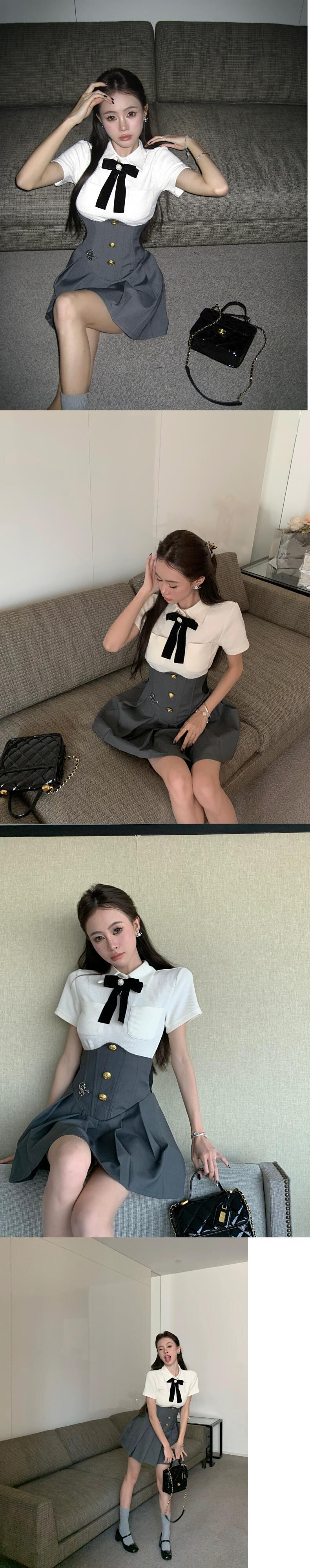 純粋な欲望スタイルのファッションスーツ女性 2023 夏の新しい蝶ネクタイシャツハイウエストプリーツスカート 2 点セット ハイウェスト リボン サマー 夏物 0921995396368501
