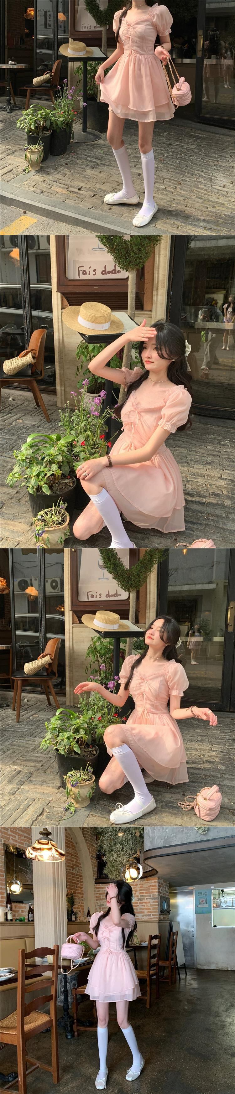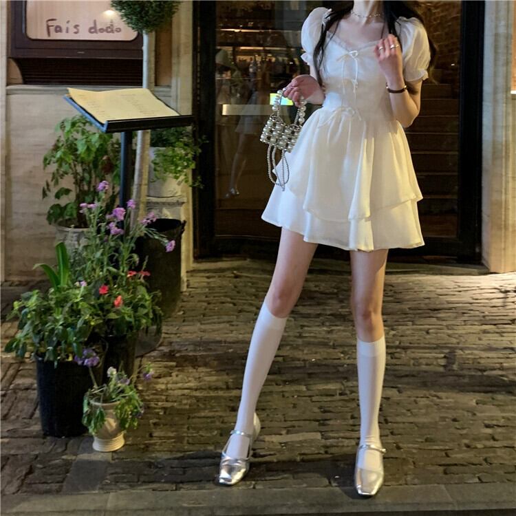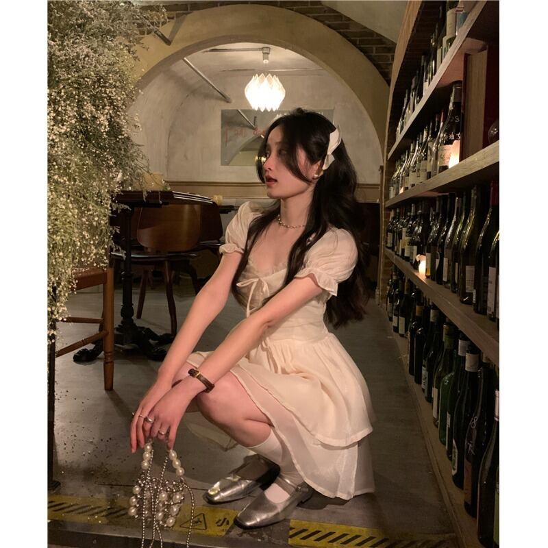 スイートリボン半袖ドレスレディース 2023 夏の新作フレンチメッシュスカートウエスト A ラインスカート 大人ガーリー スウィート キュート カジュアル サマー 夏物 Aライン 0921948255834027