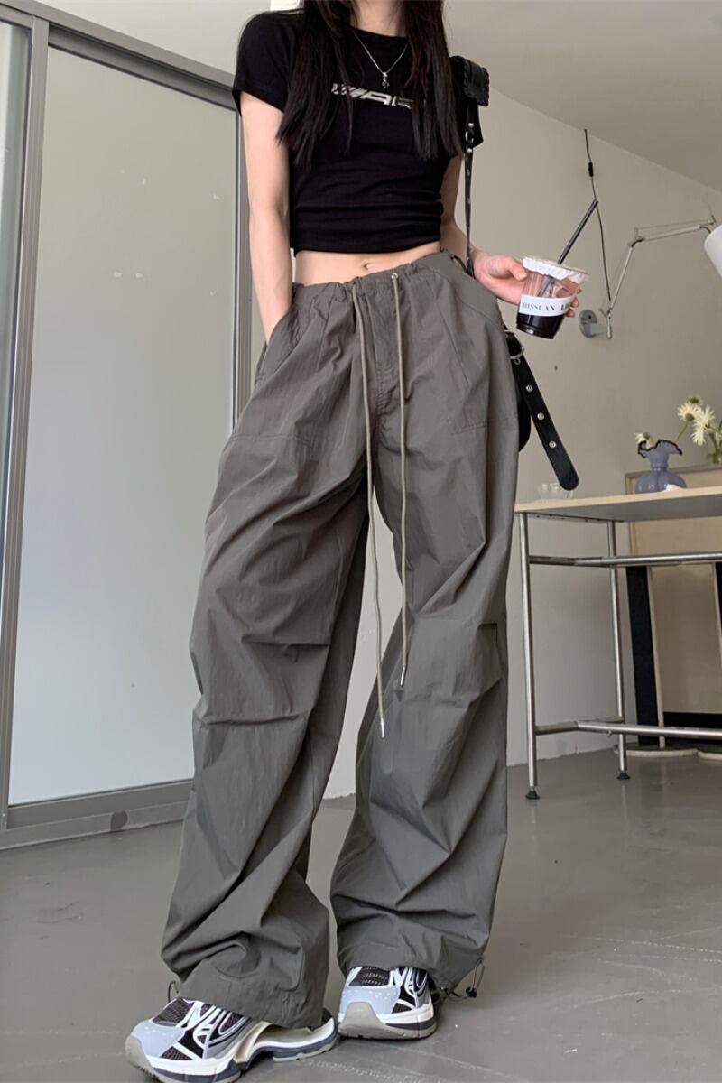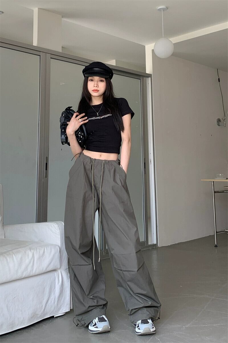ストリートスタイルファッションオールマッチツーリングカジュアルパンツ女性の夏の2023新しい巾着ハイウエストルーズスリムワイドレッグパンツ ハイウェスト サマー 夏物 0921915357383426