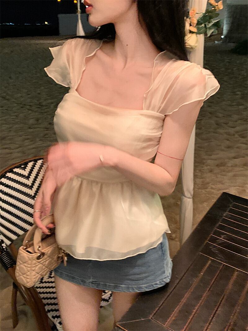 ニッチデザインセンススクエアカラーノースリーブシフォンシャツレディース2023夏新作ショートセクションスリムスリムアウタートップタイド サマー 夏物 スクウェア 0921986430376051