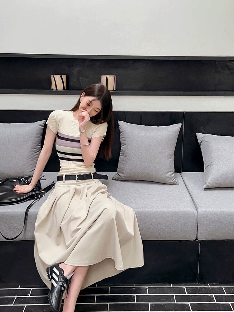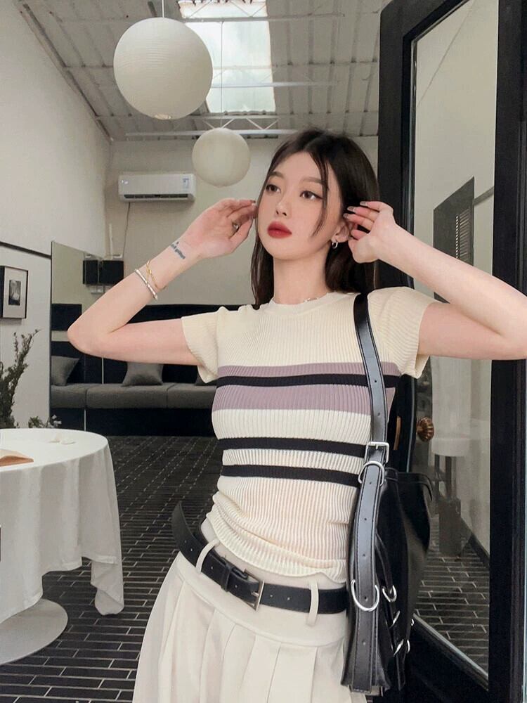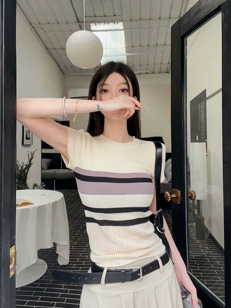 アメリカンスタイルのコントラストカラーストライプ半袖セーター女性の夏の2023新しいスリムスリムファッショントップ サマー 夏物 0921971221105427