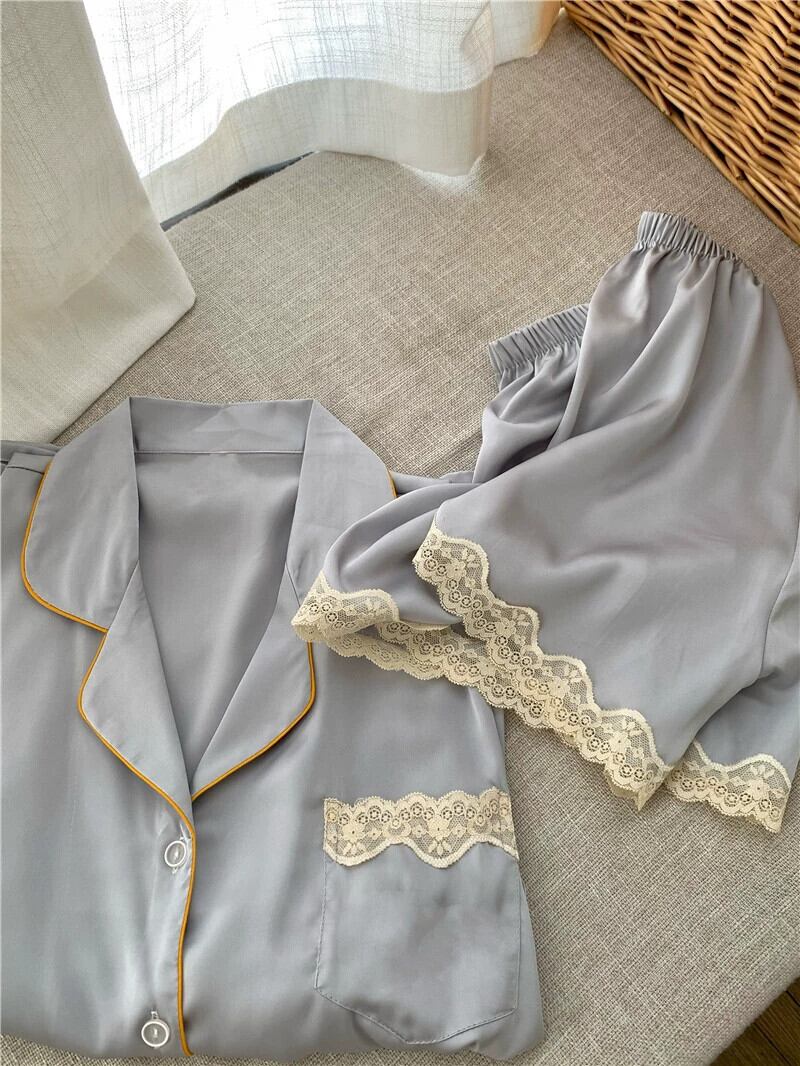 レースラペルアイスシルク半袖パジャマセット女性の夏のパジャマショーツカジュアルホームサービス 2 点セット サマー 夏物 ブルマー 0921921861576917