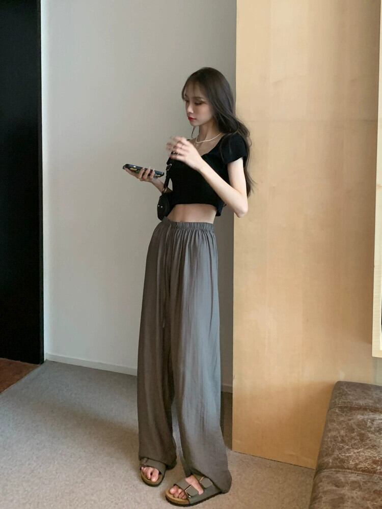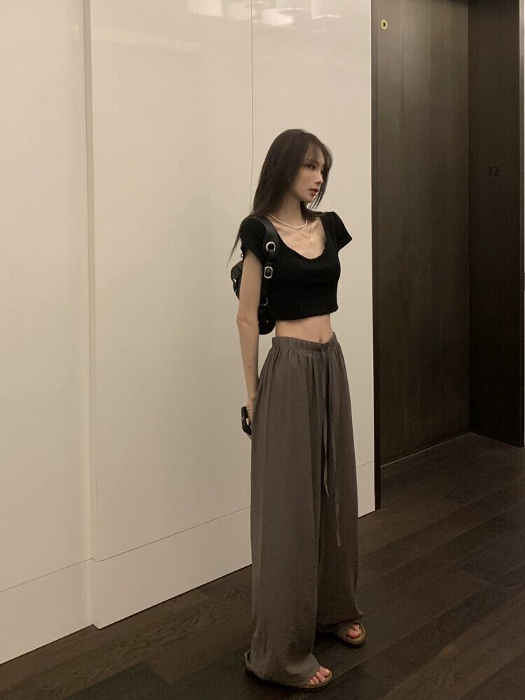 怠惰なスタイルのテクスチャ薄い巾着カジュアルパンツ女性の夏の 2023 新しいハイウエストルーズスリムワイドレッグパンツ ハイウェスト サマー 夏物 0921987784173335