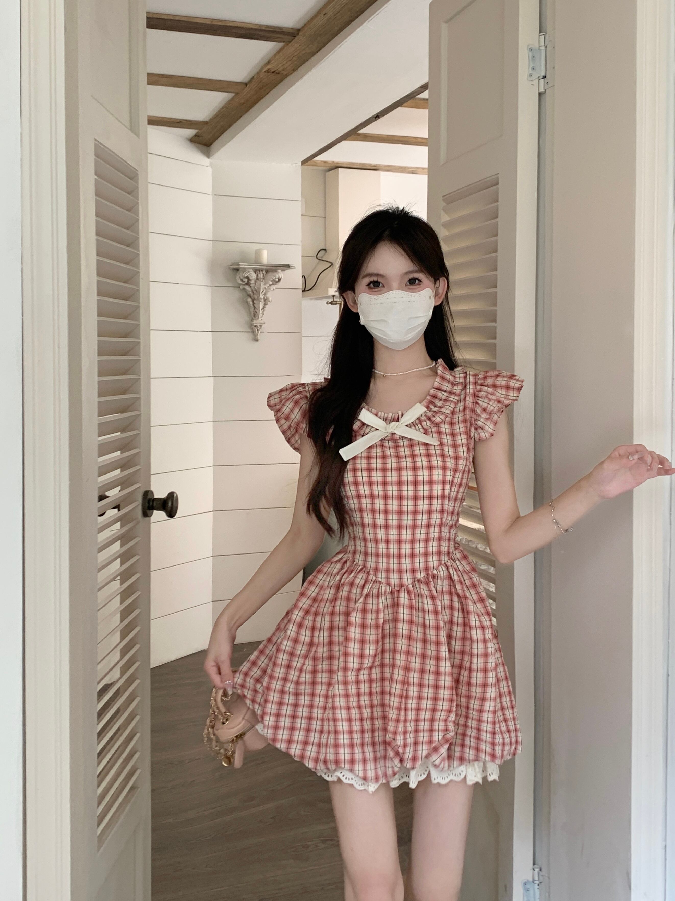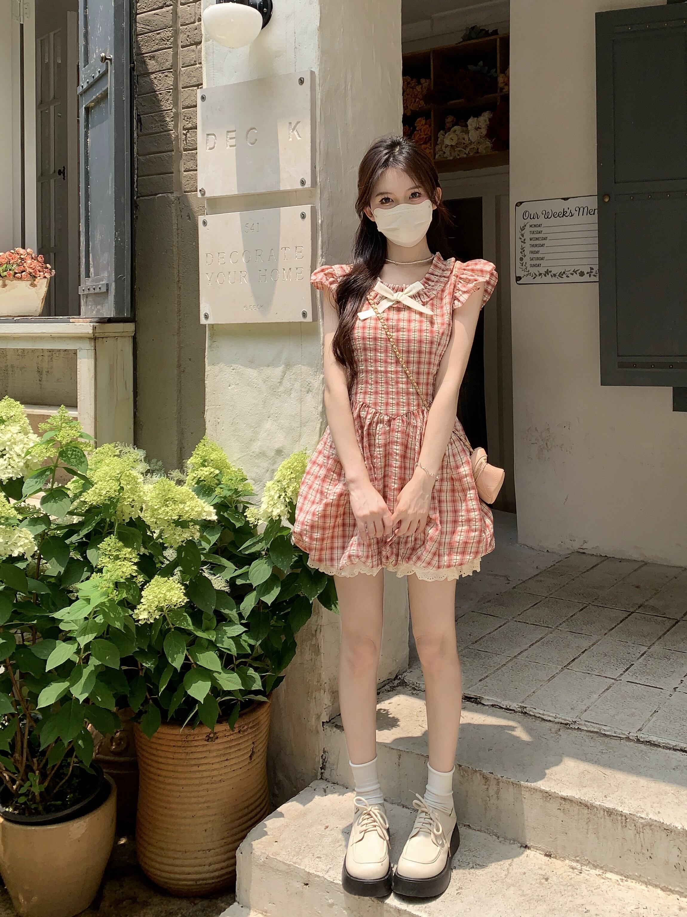 桜ピンクピーチチェック柄フライングスリーブドレス女性の夏 2023 甘いボウノットスリム芽スカート リボン 大人ガーリー スウィート キュート カジュアル サマー 夏物 0921968562346197