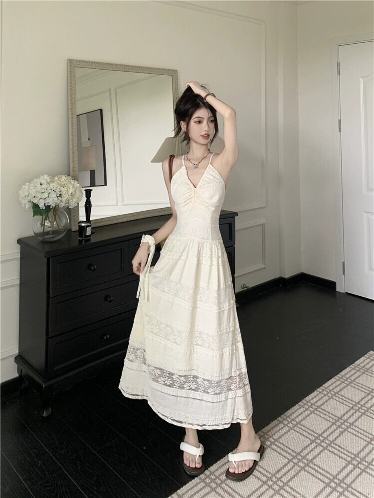 フレンチレースステッチサスペンダードレス女性の夏の2023新しい気質セクシーなバックレスウエストミッドレングススカート サマー 夏物 0921942377391005