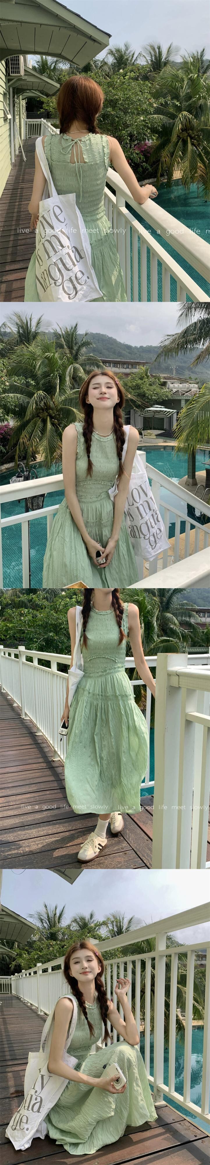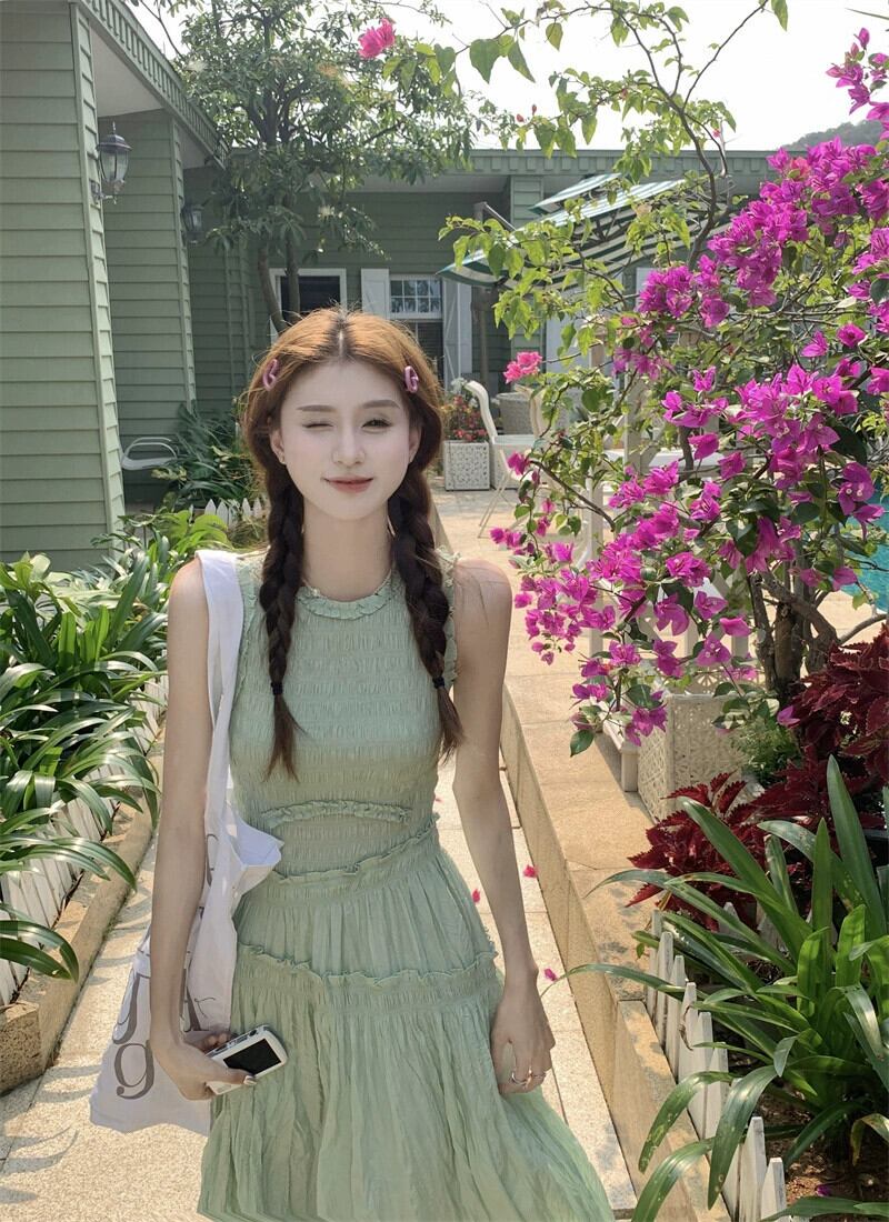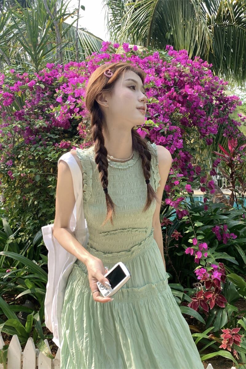 フランスの優しいスタイルのノースリーブベストドレス女性の夏の新しいプリーツウエストロングスカート高品質の気質スカート サマー 夏物 0921917373904641