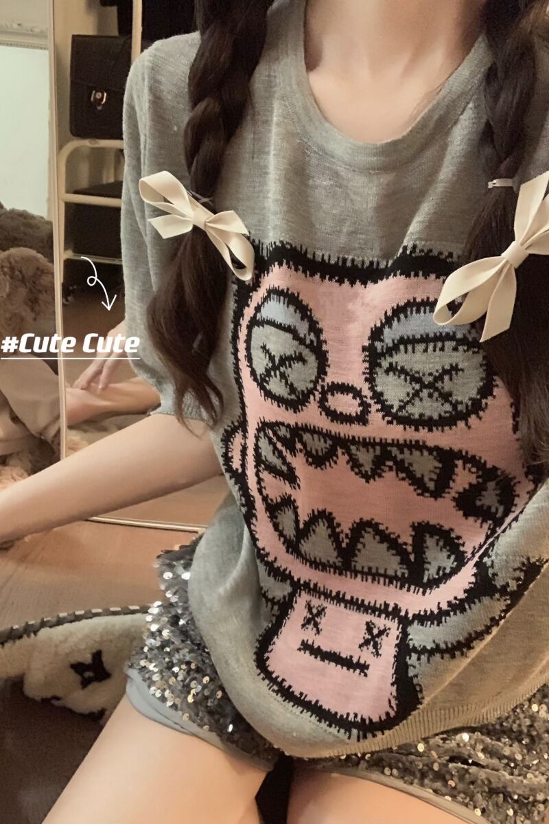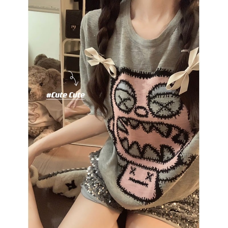 漫画モンスターデザインラウンドネック半袖 Tシャツ女性の夏の 2023 新しいニッチルーズオールマッチプルオーバートップ サマー 夏物 Oネック 0921970185126121