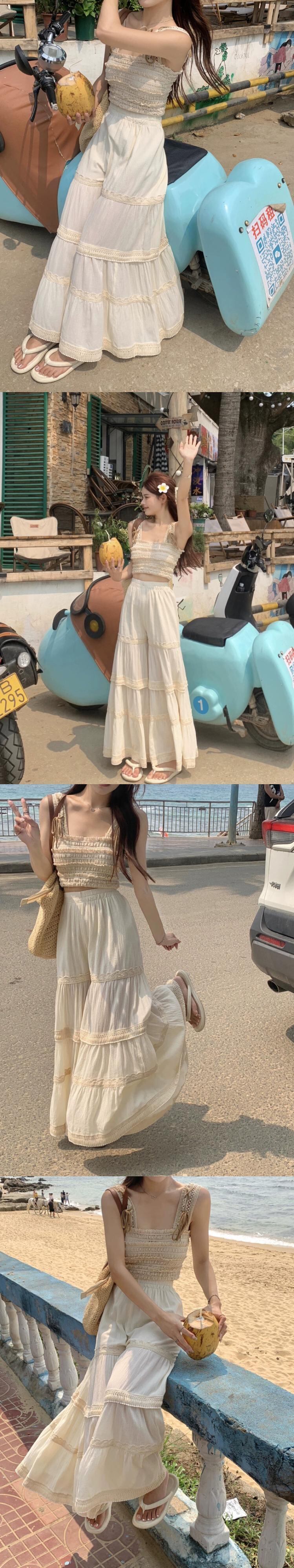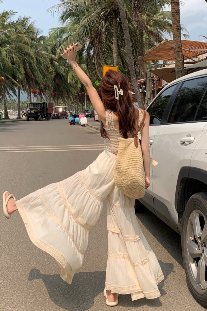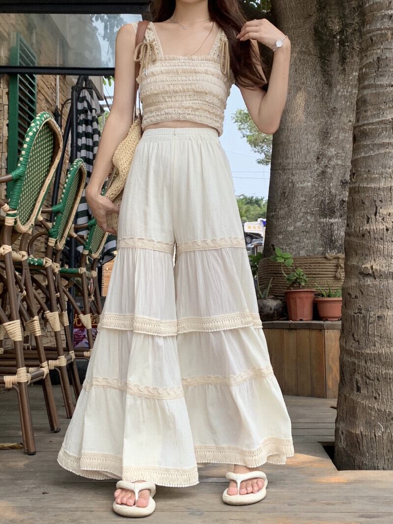 シックなデザインセンススーツレディース 2023 新作レースステッチキュロットくり抜きサスペンダートップ 2 点セット サマー 夏物 0921968648771502