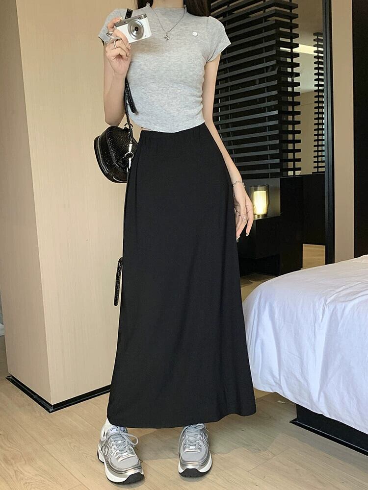黒ハイウエストドレープ薄手スカートレディース 2023 夏の新デザインセンス気質オールマッチ A ラインミドル丈スカート ハイウェスト ブラック サマー 夏物 Aライン 0921950978191157