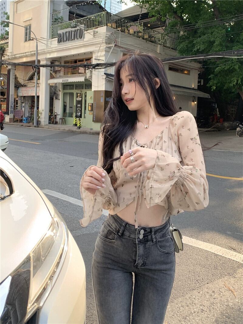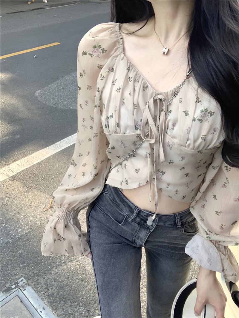 気質 V ネックレトロ花柄長袖シャツ女性の夏の 2023 新しいウエスト痩身ショートシフォンシャツ ロング サマー 夏物 Vネック 0921936024664021