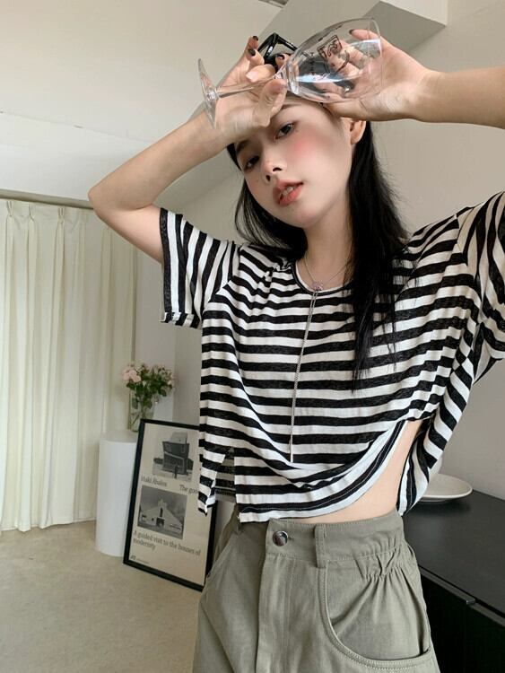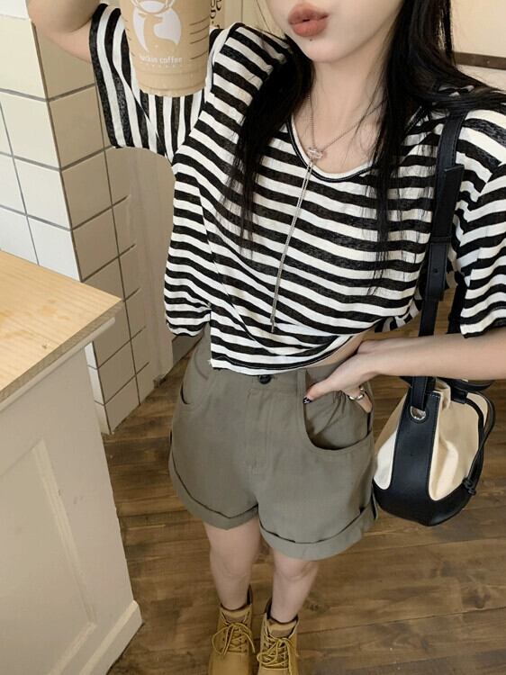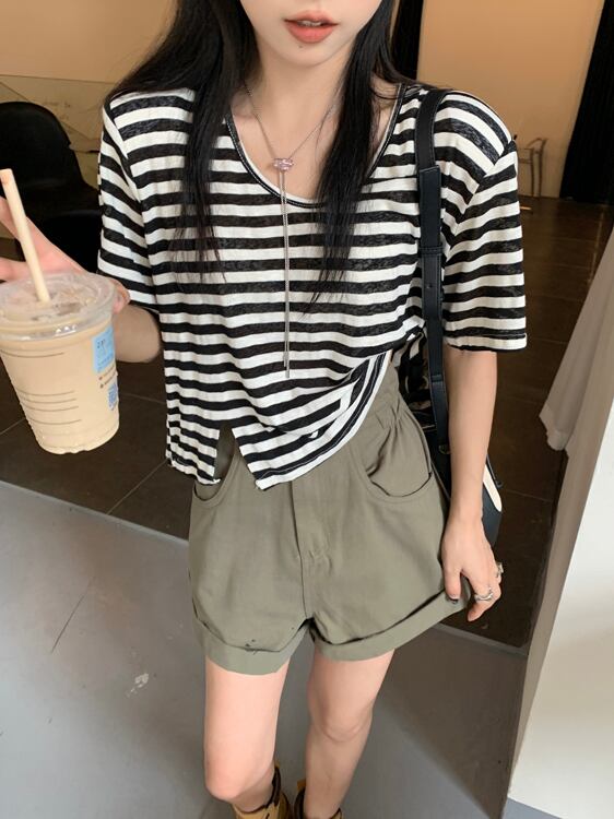 オールマッチカラーコントラストストライプ半袖Tシャツレディース2023年夏新デザイン感覚スリットルーズラウンドネックトップス サマー 夏物 Oネック 0921983791705626