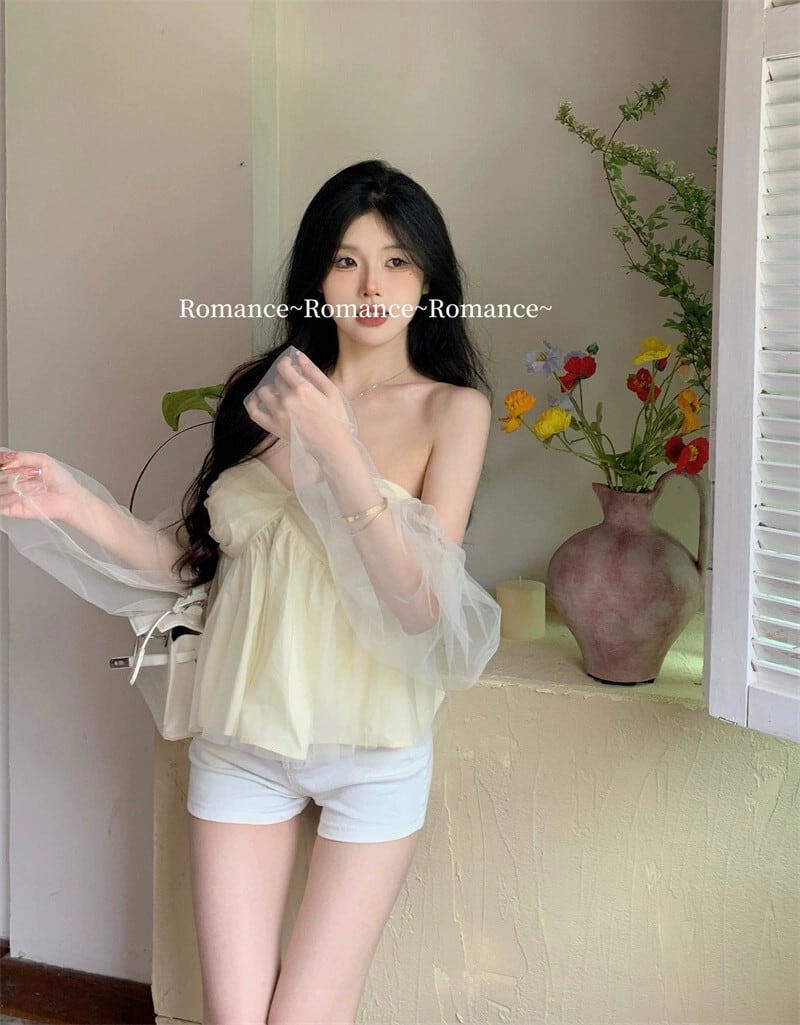 大気メッシュワンショルダーシフォンチューブトップシャツレディース夏純粋な欲望オフショルダーショートラップチェストシャツトップ サマー 夏物 ピュア 0921991092041243