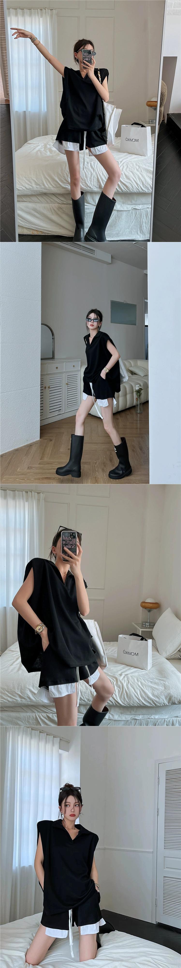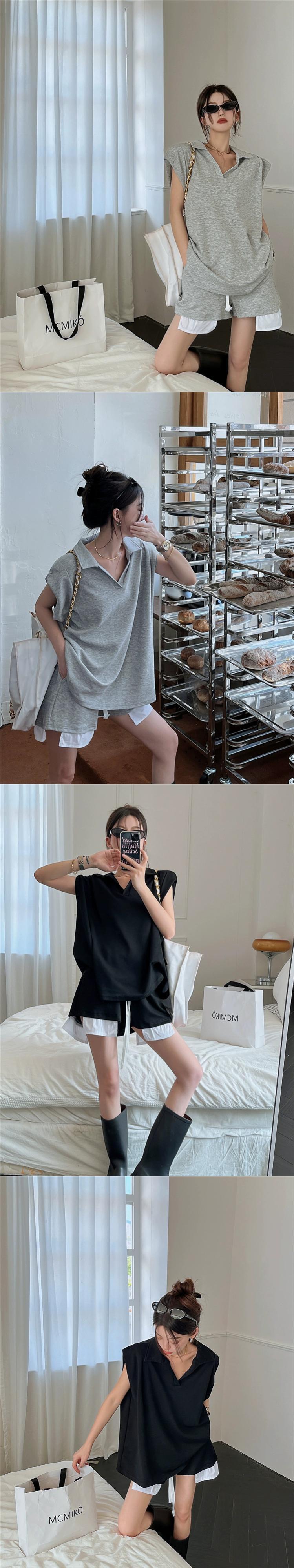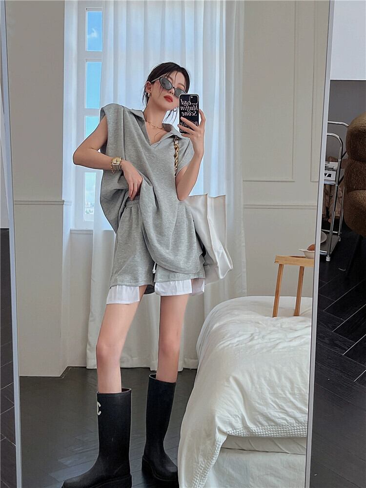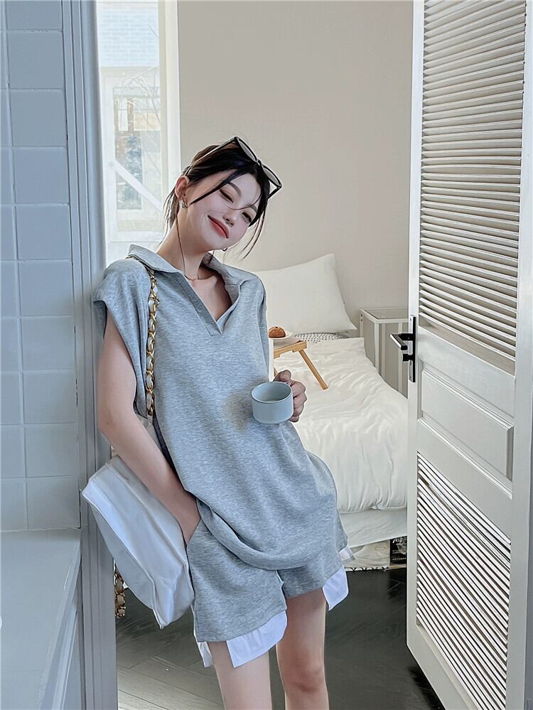 カジュアルスポーツスタイルスーツの女性の夏の 2023 新作ポロカラーノースリーブ Tシャツスプライシングショーツ 2 点セット サマー 夏物 ブルマー 0921986365000461