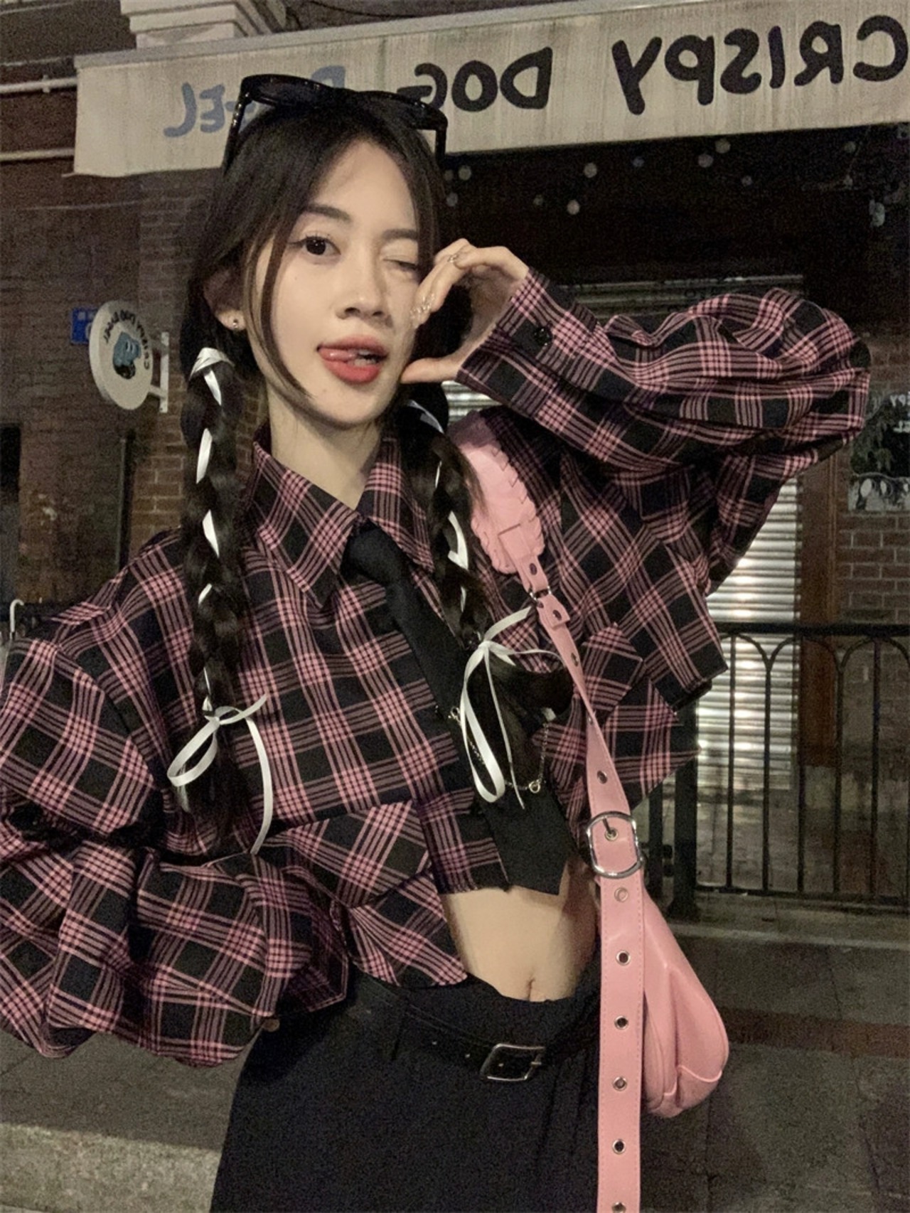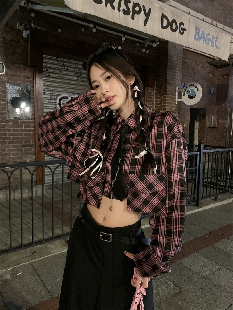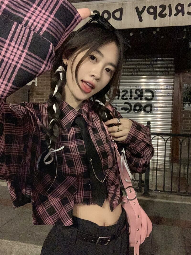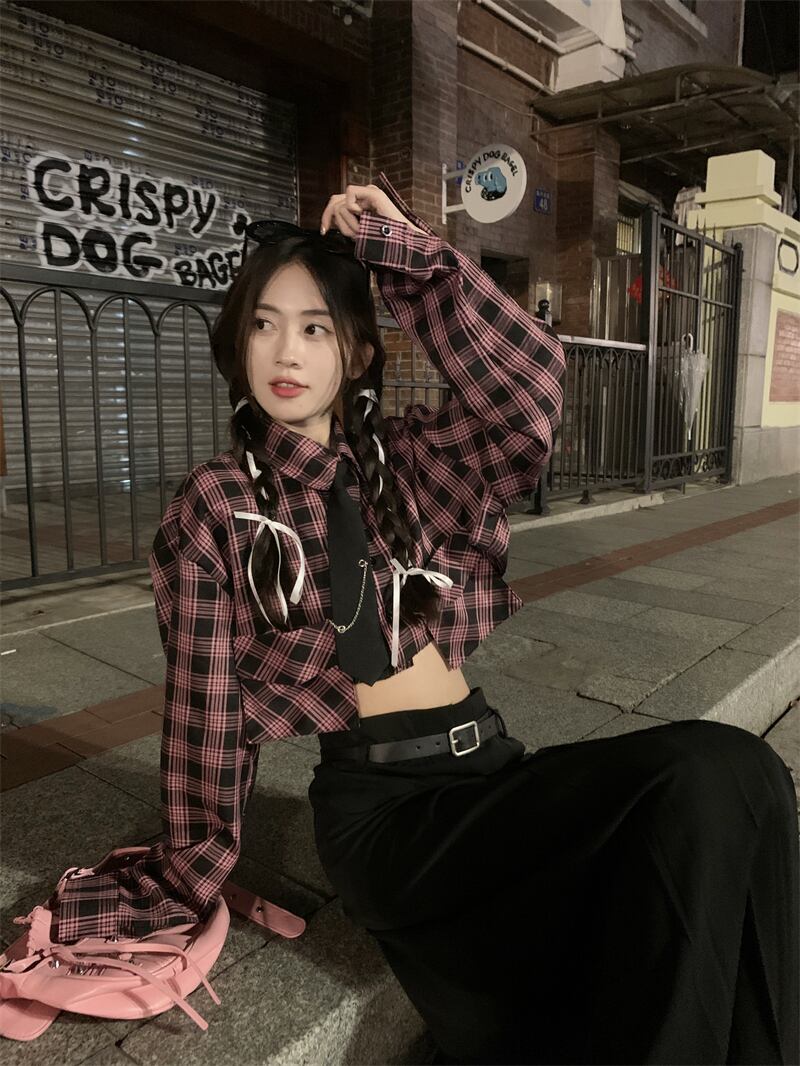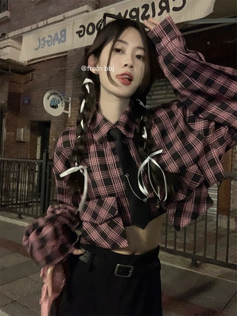 甘くて涼しい風コントラストカラーチェック柄シャツレディース2023年夏新作長袖日焼け止めシャツ不規則ショートトップ ロング 大人ガーリー スウィート キュート カジュアル サマー 夏物 0921945950752163