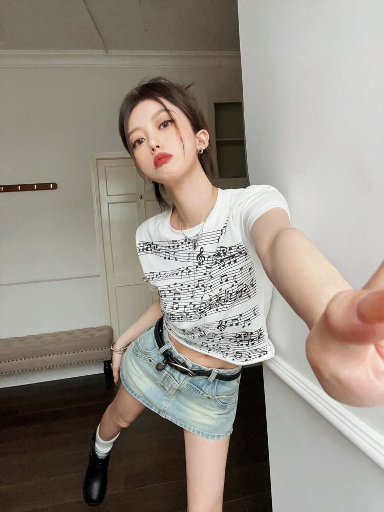 アメリカンレトロ音符プリントショルダー半袖Tシャツレディース2023年夏新作インオールマッチスリムショートトップ サマー 夏物 0921935191451884