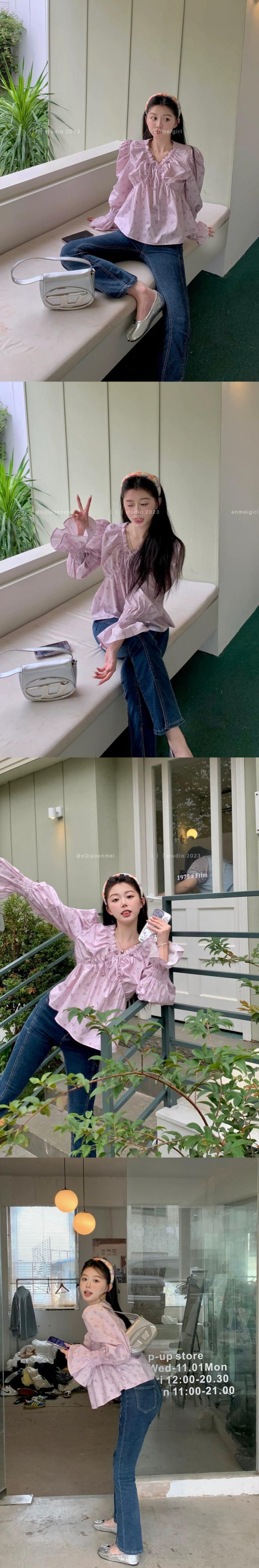 優しい紫の花柄 V ネックプリーツ長袖シャツ女性の夏の 2023 新しいショートルーズスリムシャツイン ロング サマー 夏物 Vネック パープル 0921992270048643
