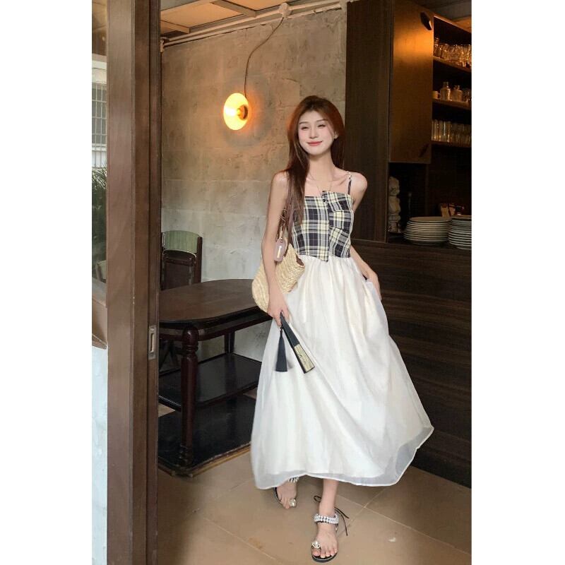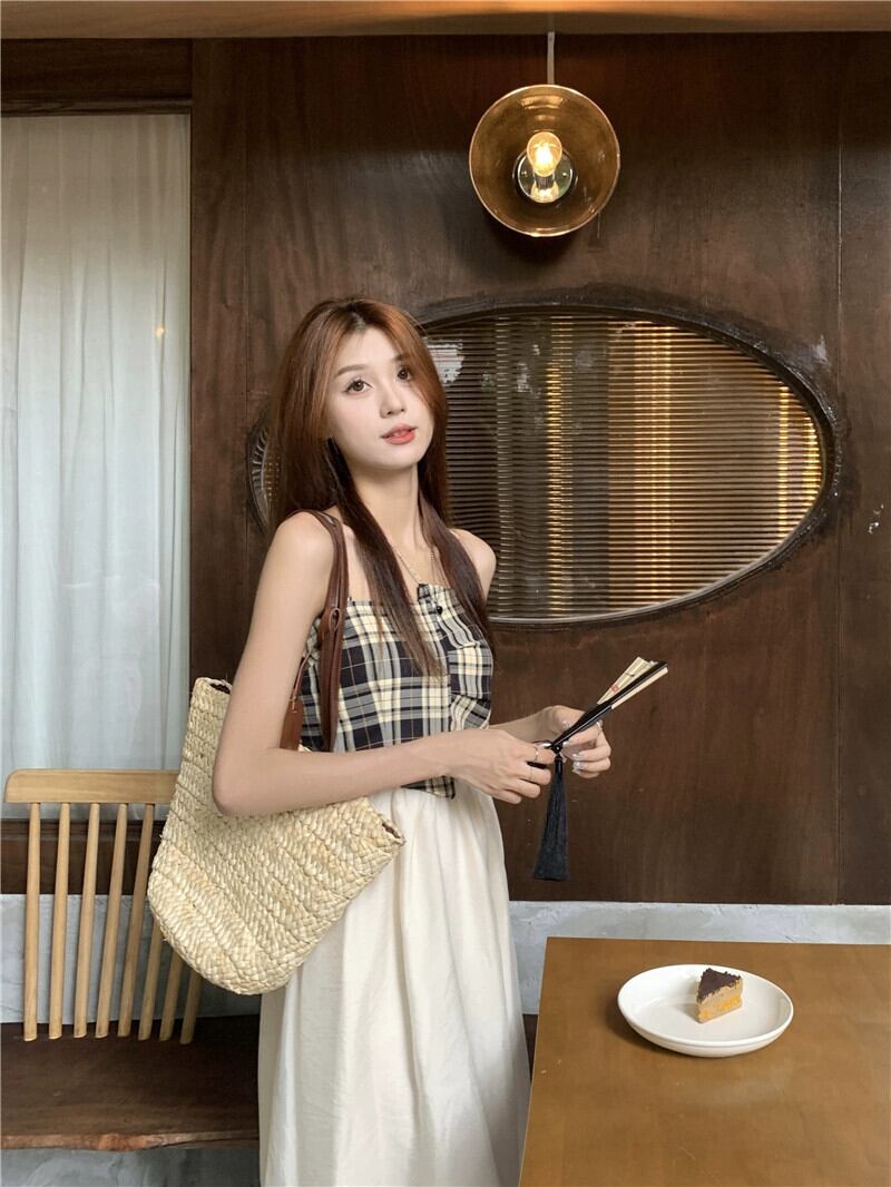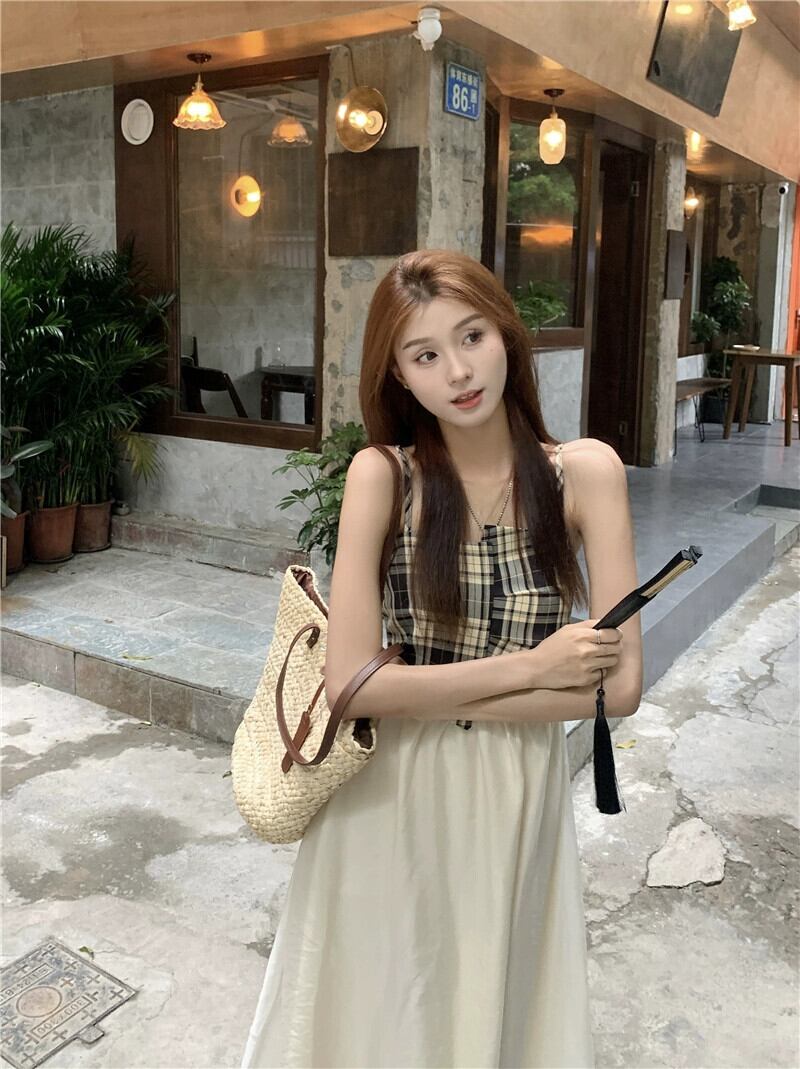 フレンチレトロチェック柄ステッチサスペンダードレス女性の夏の2023新しいスリムで薄いアウターウェアミッドレングススカート サマー 夏物 0921986682730449