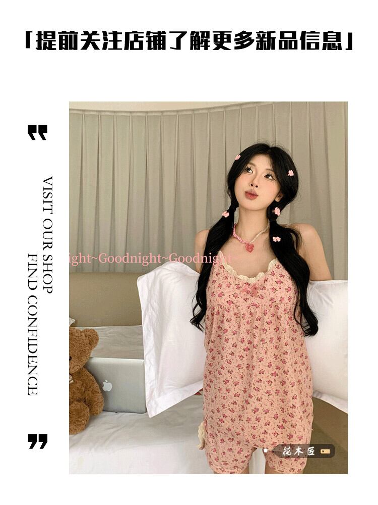 かわいい花柄レースパジャマセット女性の 2023 夏の新スタイル胸パッドサスペンダーショーツホームサービス 2 点セット 大人ガーリー スウィート キュート カジュアル サマー 夏物 ブルマー 0921911751560347