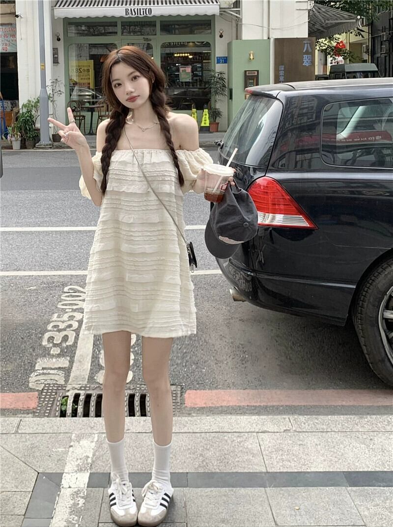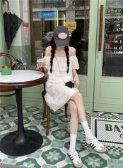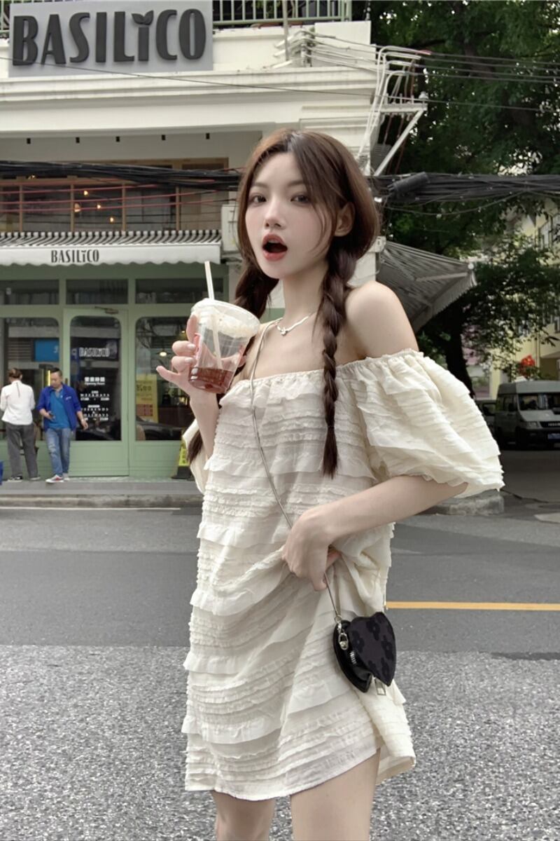 ワンショルダージャカードドレスレディース2023年夏新作ゆったり甘いパフスリーブショートスカート 大人ガーリー スウィート キュート カジュアル サマー 夏物 0921968783241367