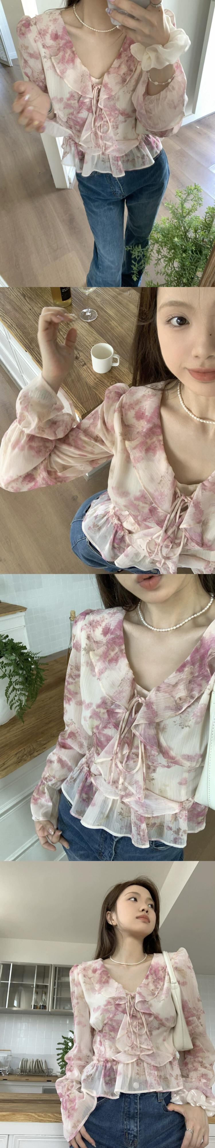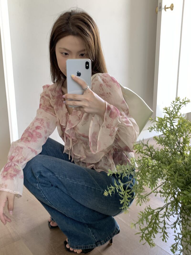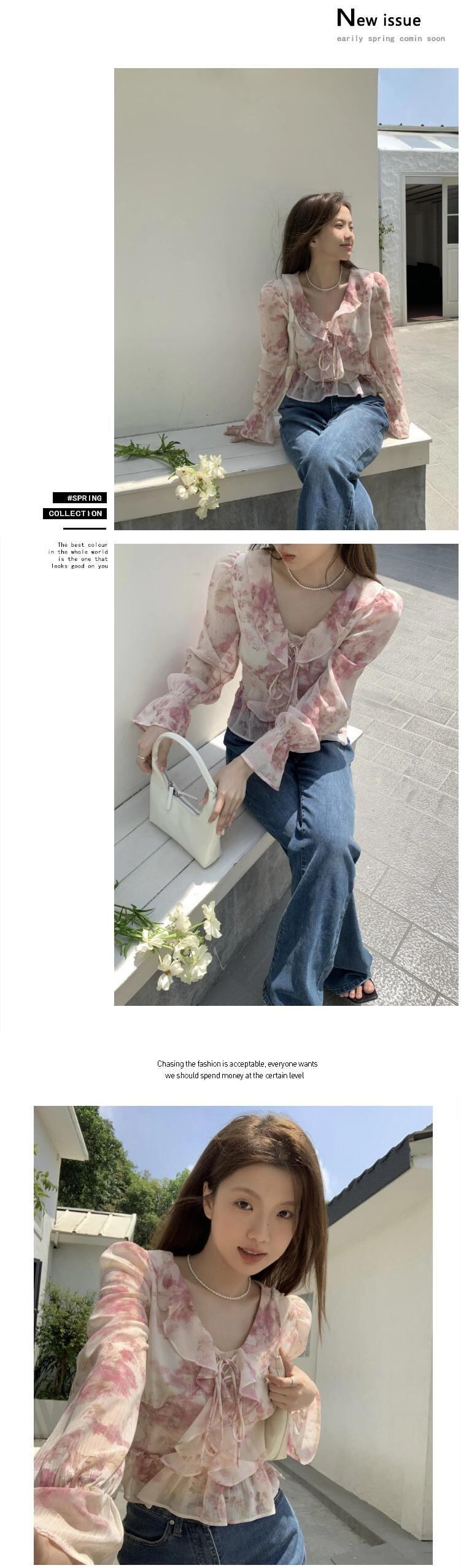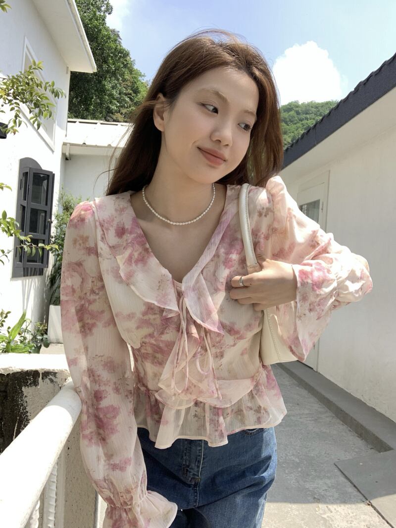 フランスの優しい風の花柄シフォンシャツレディース2023年夏新作トランペットスリーブデザインフリルVネックトップ サマー 夏物 0921985564858123