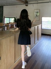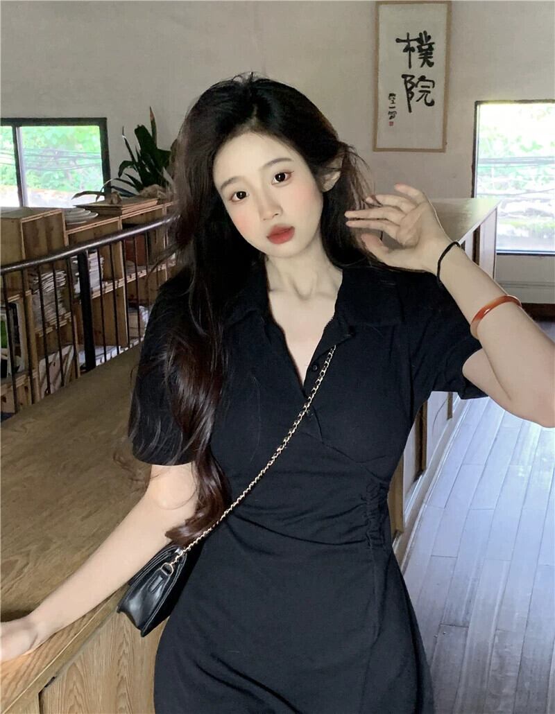 レトログレー V ネックバブル半袖ドレスの女性の夏パッケージヒップスカートデザインセンススリムプリーツスカート サマー 夏物 Vネック 0921964581852072