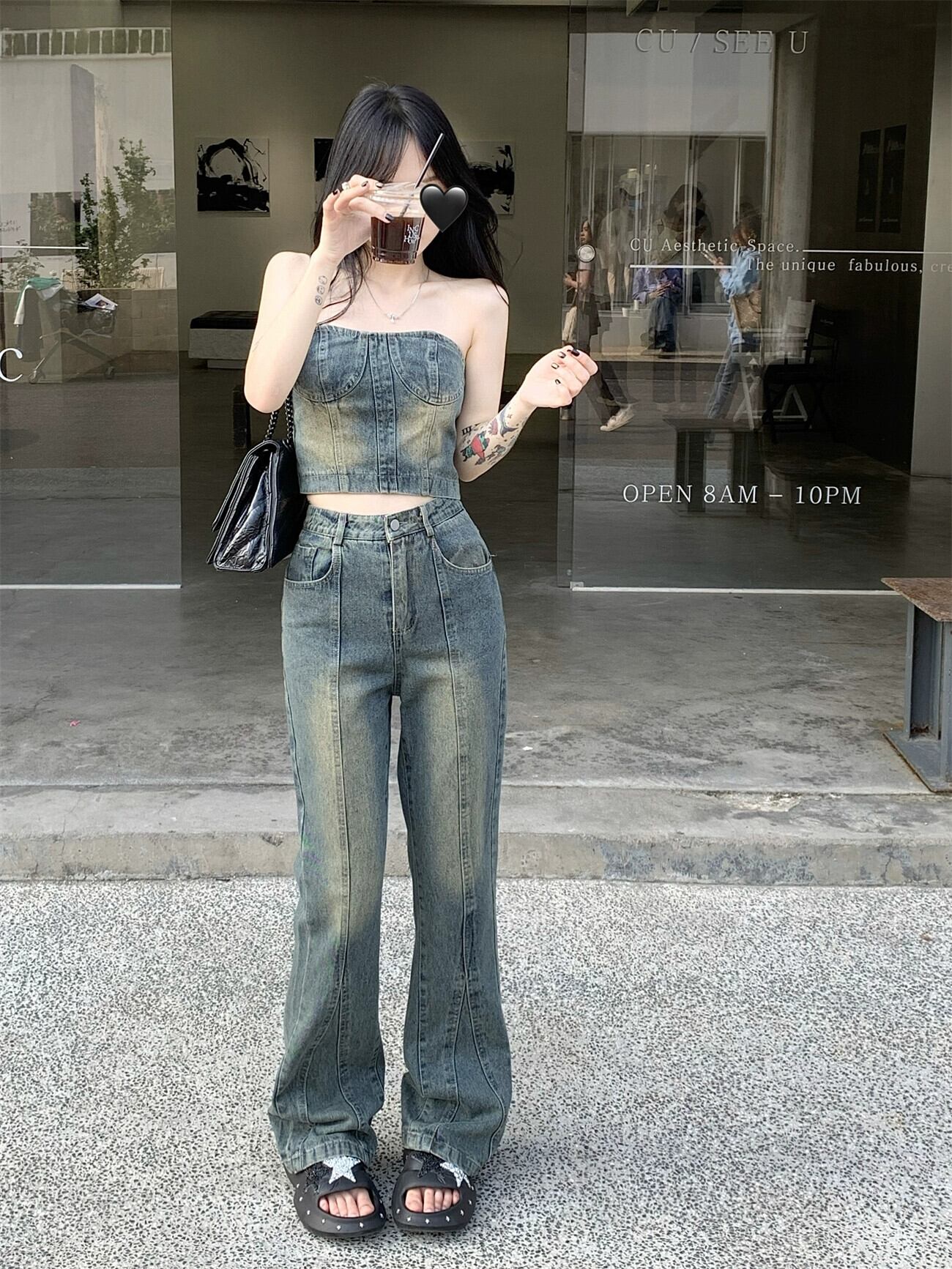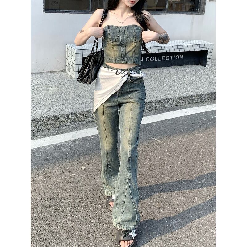 レトロなスタイルのファッションスーツの女性の 2023 夏の新しいラップ胸デニムベストマイクロラモップパンツ 2 点セット サマー 夏物 0921910072440002