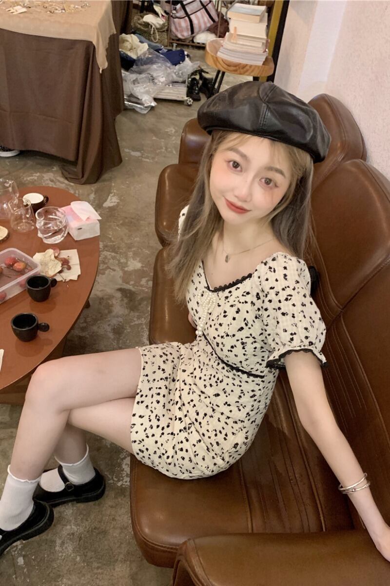 小さな背の高いウエスト花柄ドレス女性の夏フレンチ V ネックパフスリーブショートスカート気質ウエストバッグヒップスカート サマー 夏物 Vネック 0921951094284183