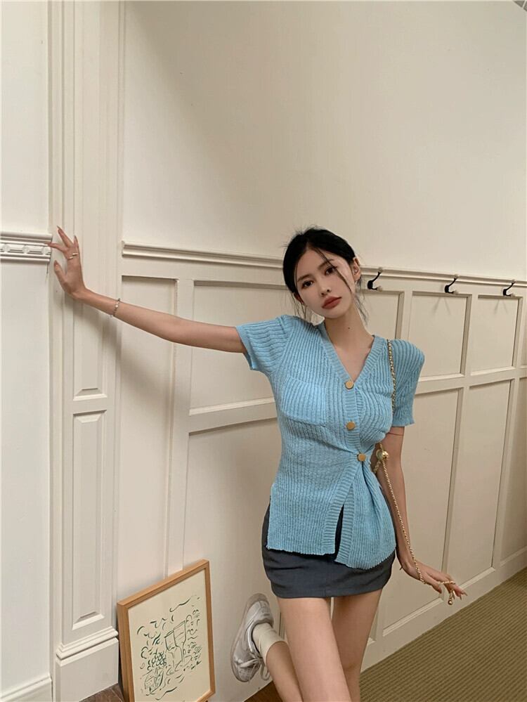 不規則な斜めボタン半袖ニットセーター女性の夏の 2023 新しいウエストラインスリム気質 V ネックカーディガントップ サマー 夏物 Vネック 0921916241856327