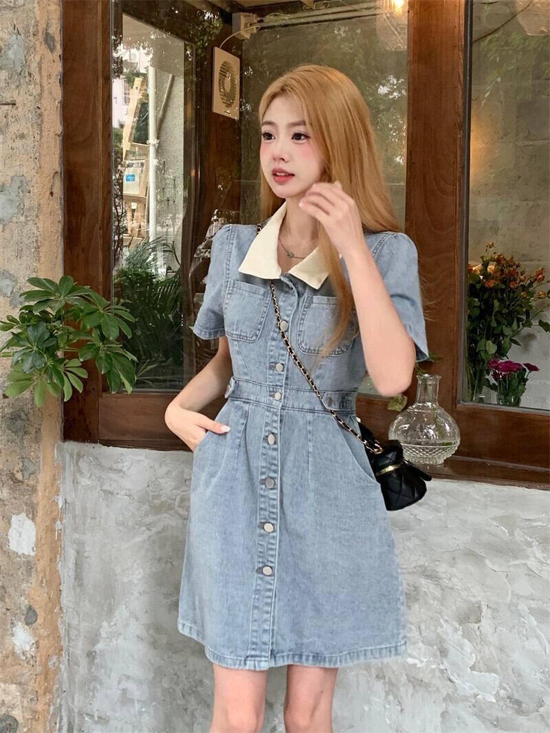 甘くてクールなスタイルのポロカラー半袖デニムドレスレディース 2023 夏の新しいスタイルのウエスト痩身スリットショートスカート 大人ガーリー スウィート キュート カジュアル サマー 夏物 0921953362634705