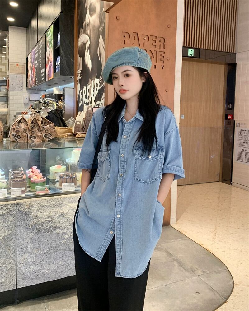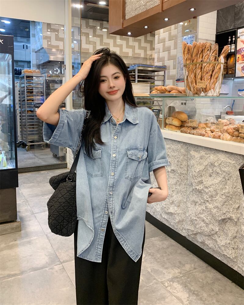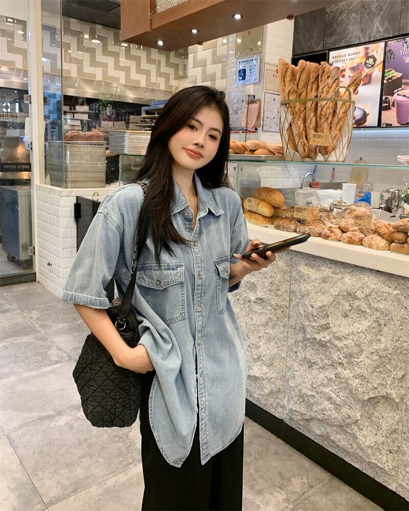 ハイエンドルーズデニム半袖シャツ女性の夏の 2023 新しいミッドレングススリムカーディガンシャツ潮 サマー 夏物 0921926625553106