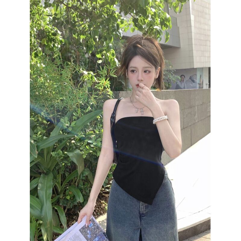 スパイスガール ブラック イレギュラー ショート チューブ トップ ベスト トップ レディース サマー スーツ デニム ワイドレッグ ロング パンツ 2 点セット 夏物 0921990285405111
