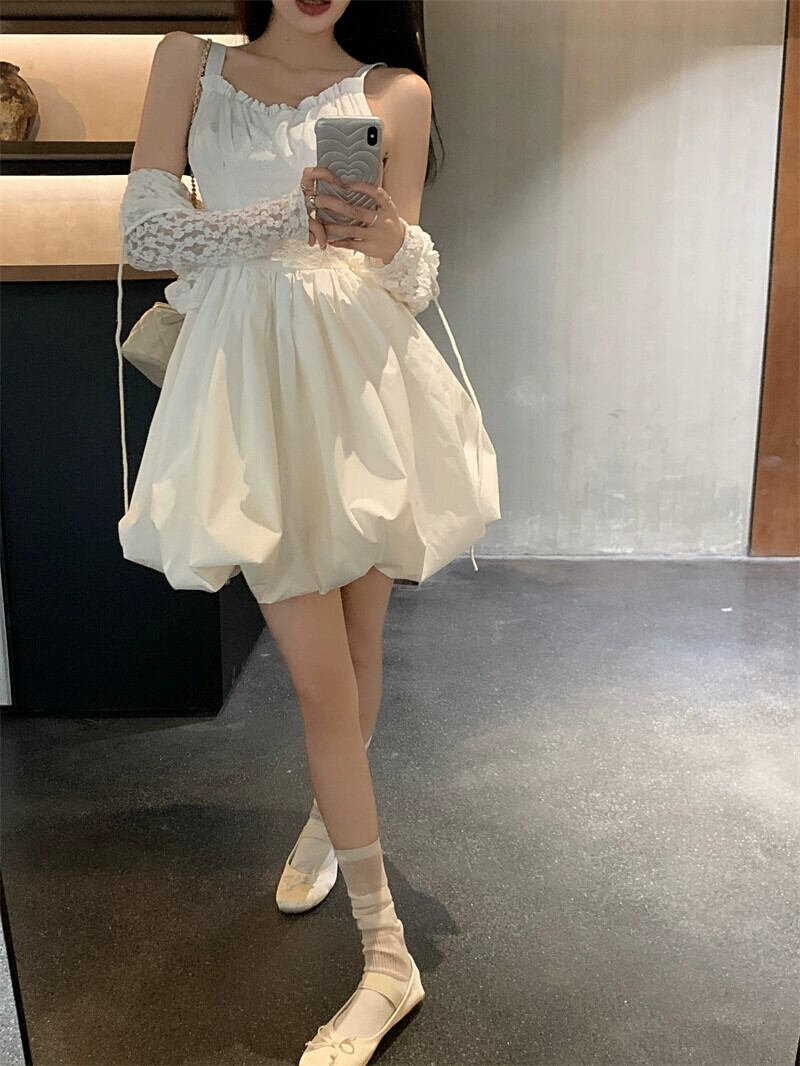 フレンチスタイルのハイエンドフィッシュボーンサスペンダードレス女性の夏の白いふわふわ花のつぼみスカートウエスト痩身ショートスカート ホワイト サマー 夏物 フラワーデザイン 0921933928202167