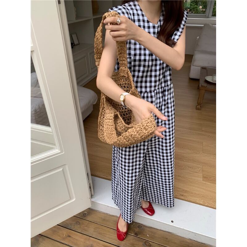 シックな黒と白のチェック柄ノースリーブジャンプスーツ女性の夏の 2023 新しいストラップウエストワイドレッグロングパンツ ホワイト ブラック サマー 夏物 0921939535452810